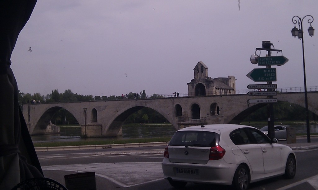 After stocking up we bid a sad farewell to Phil and Julie who’ve headed off on the ‘Monaco Loop’. They’re meeting friends in the Camarge in a week, so are nipping to drive their Ambulance around the Monaco Grand Prix circuit, and maybe pop over to Italy for a spot of lunch. We left shortly after them, and then subsequently overtook them as they had stopped in town for the regular McDonalds wifi session. As we drove through Avignon I snapped the bridge that every French child knows from the nursery rhyme ‘Sur le pont d’Avignon’, although it’s actually called something else.