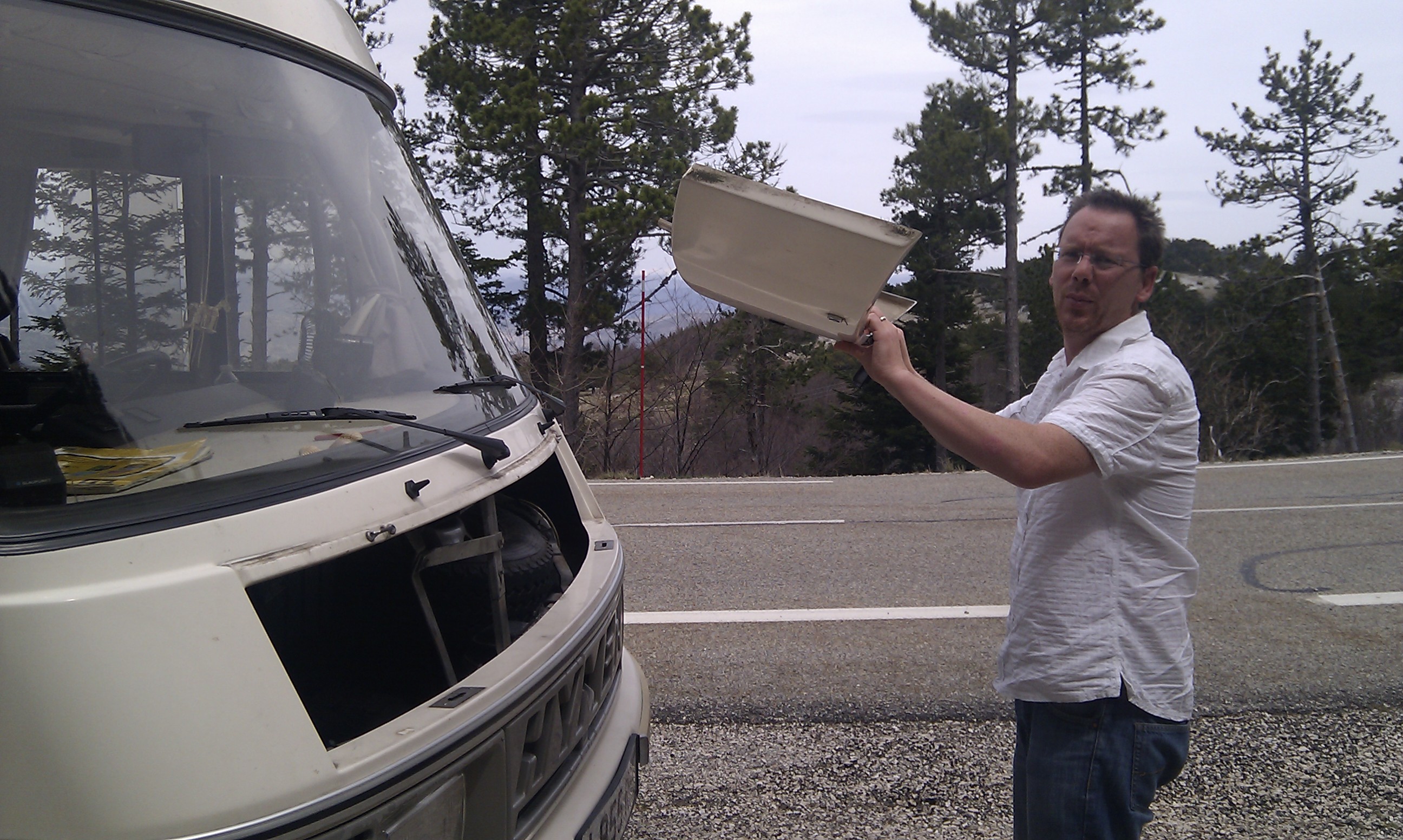 We made our way towards Mont Ventoux. I’d seen it on the telly during a stage of the Tour de France back in 2009 and when I realised we were in the area I figured Dave could do with a challenge. We started to climb up from Malaucene in the North West and over 21.5kms we climbed 1570m. We stopped about 3/4 of the way up as the temperature in Dave’s engine crept up and we started to smell burning. Jay opened Dave’s bonnet and lovingly fanned his engine and soon we were back on our way again.