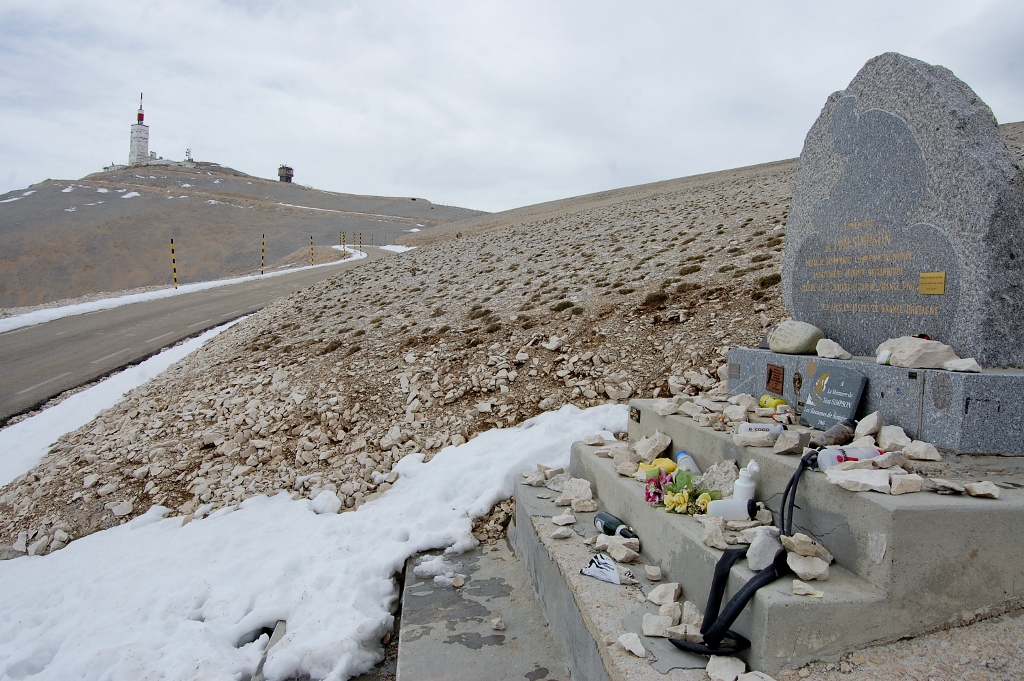 We stopped at the memorial to Tom Simpson, Britain’s first men’s road race World Champion (matched only by Mark Cavendish last year). He died of exhaustion within half a mile of the summit during the Tour de France in 1967. It was humbling to see the tributes other cyclists had laid by his memorial and the plaques left by his family. The most moving thing is that you can see just how close he was to his goal.