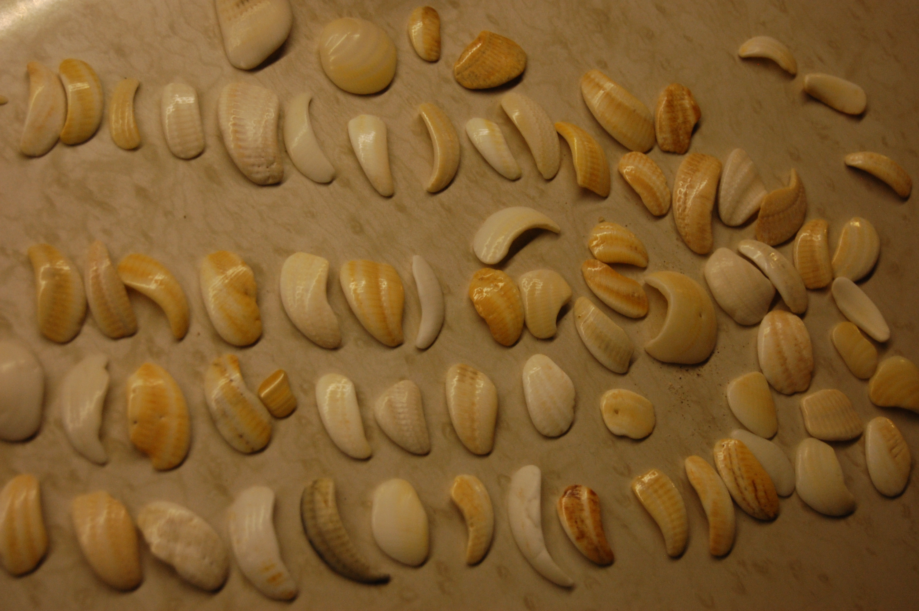 - Polished shell pieces. We’re going to make them into necklaces, or something.