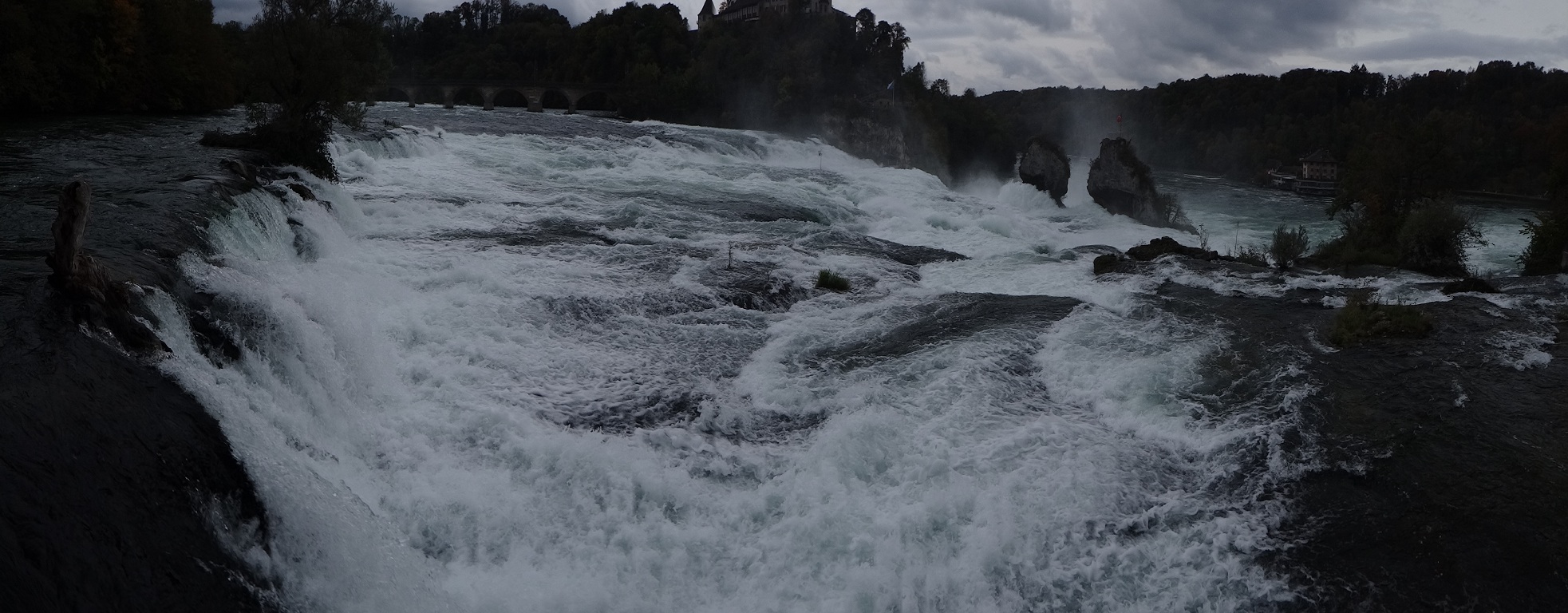 The magnificent Rheinfall. Folks can take a boat to the isolated rock in the middle and climb steps to stand above the torrent.