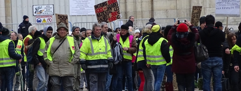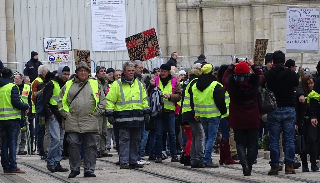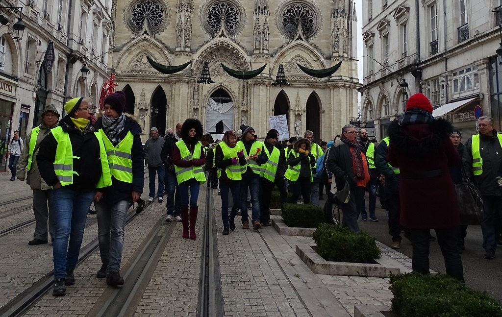 After a look-see around the cathedral we bumped into the vests again as they followed a random route through the city and took the chance to ask one of them why he was there. He looked a bit bemused, perhaps at the existential nature of the question, so I tried another tact and asked if he didn’t like Macron. “Ah, non, c’est Europe!” he said, indicating (we think) that he thought the problem, whatever it was, was bigger than Macron. After a few minutes of earnest discourse, in which we picked out something to do with borders, a pyramid of power, Brexit and the need to earn money to feed his two children, we shook hands, wished him the best of luck and let him rejoin the vests, who were wandering off again. I really need to improve my French before entering into political discussions I think, but my suspicion is he wasn’t typical of the vests.