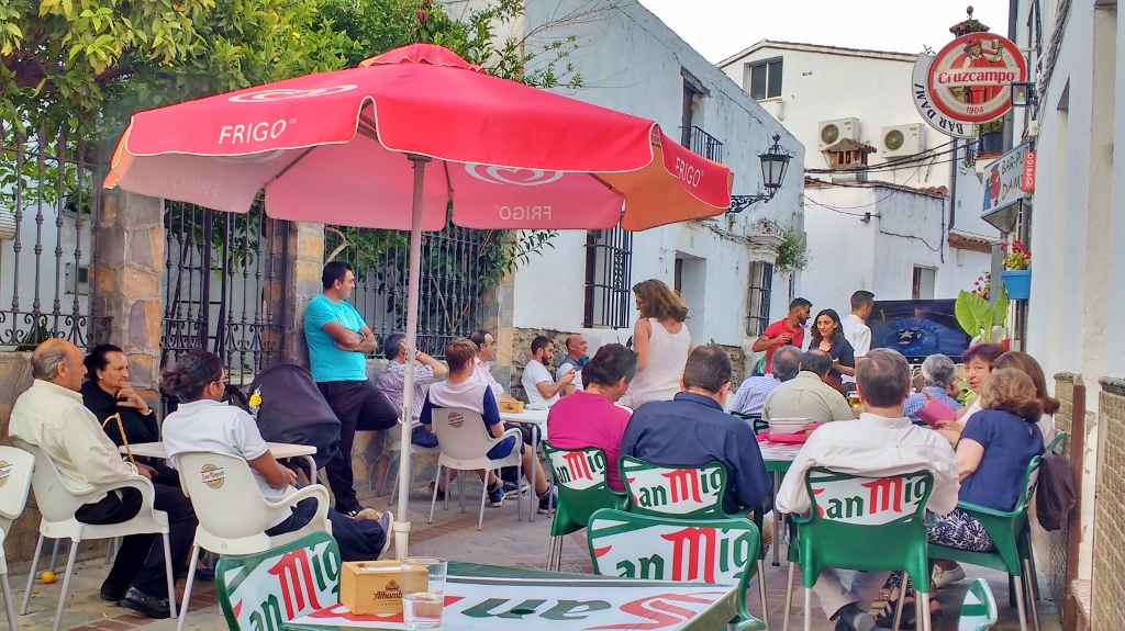 As the sun set behind the sierra and the air cooled, we were treated to a home cooked, spicy hot chilli from Mary. Once the fire in our mouths had been extinguished we wandered back into the town to take Charlie for a walk. The parties seemed to be undergoing a change-over, day time guests leaving as evening guests arrived? Or were people just doing the rounds as they would undoubtedly know all of the girls? Then we think we discovered the reason for the people leaving. The TV at the tiny bar we’d eaten tapas in the night before with Dave, Mary, Stuart and Jean (basically everyone stopping at the aire) had dramatically increased in size and the tables and chairs around it were filling up. Religion may play a strong part in people’s lives around here, but football looks like it is an even bigger draw.