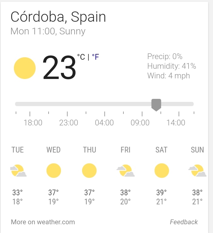 This afternoon, after a post lunch snooze, the maps came out again. The weather here is getting too hot for us (as Peter Kay would say ‘I like it hot….but not this hot’) and poor Charlie is spending all day under a wet towel to keep him cool. It looks like it is only going to get hotter over the next week, so it’s time to head north. We’re going to try and reach Cordoba before it hits 37°C on Wednesday, then drive for the Spanish north coast.