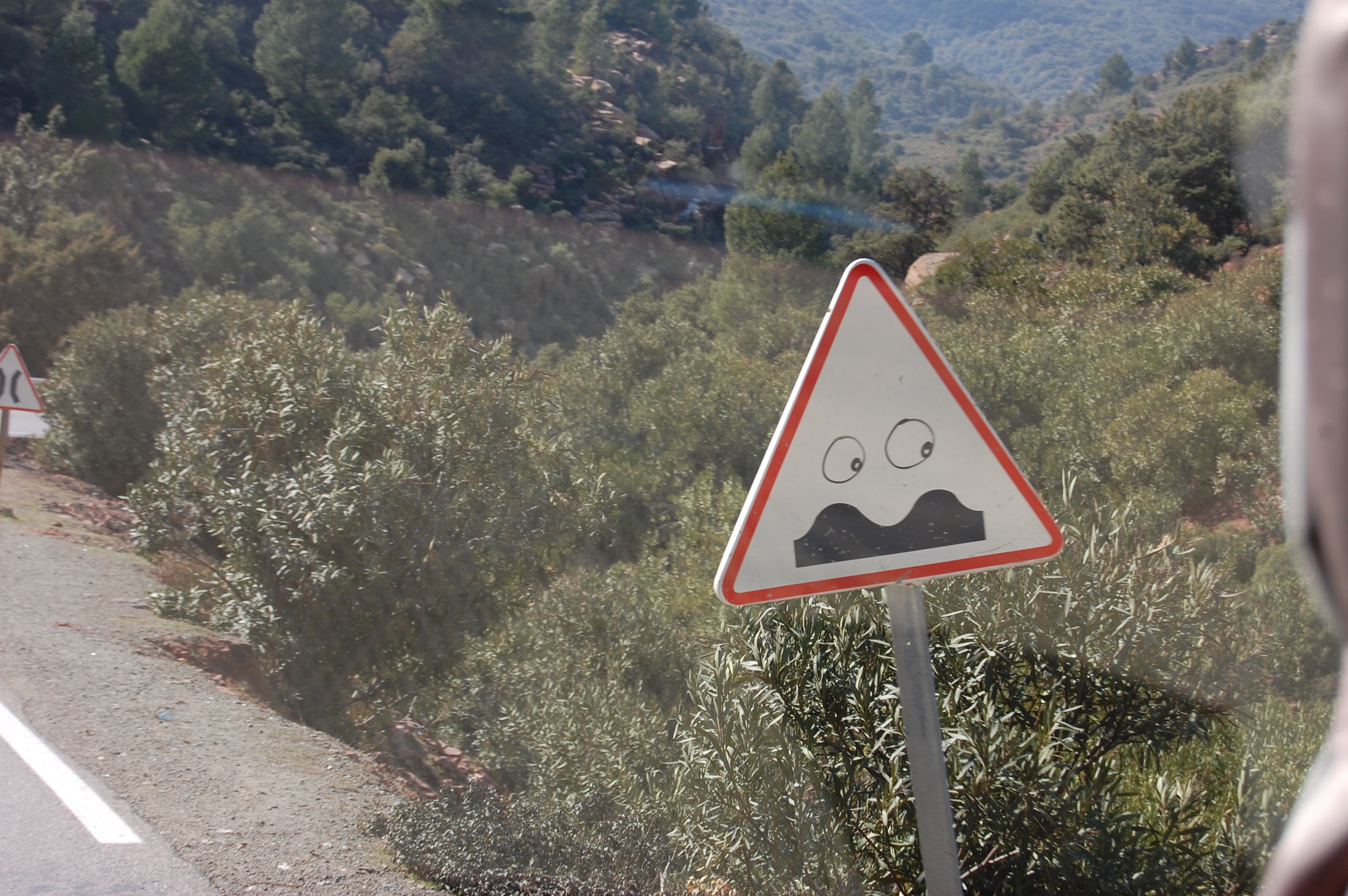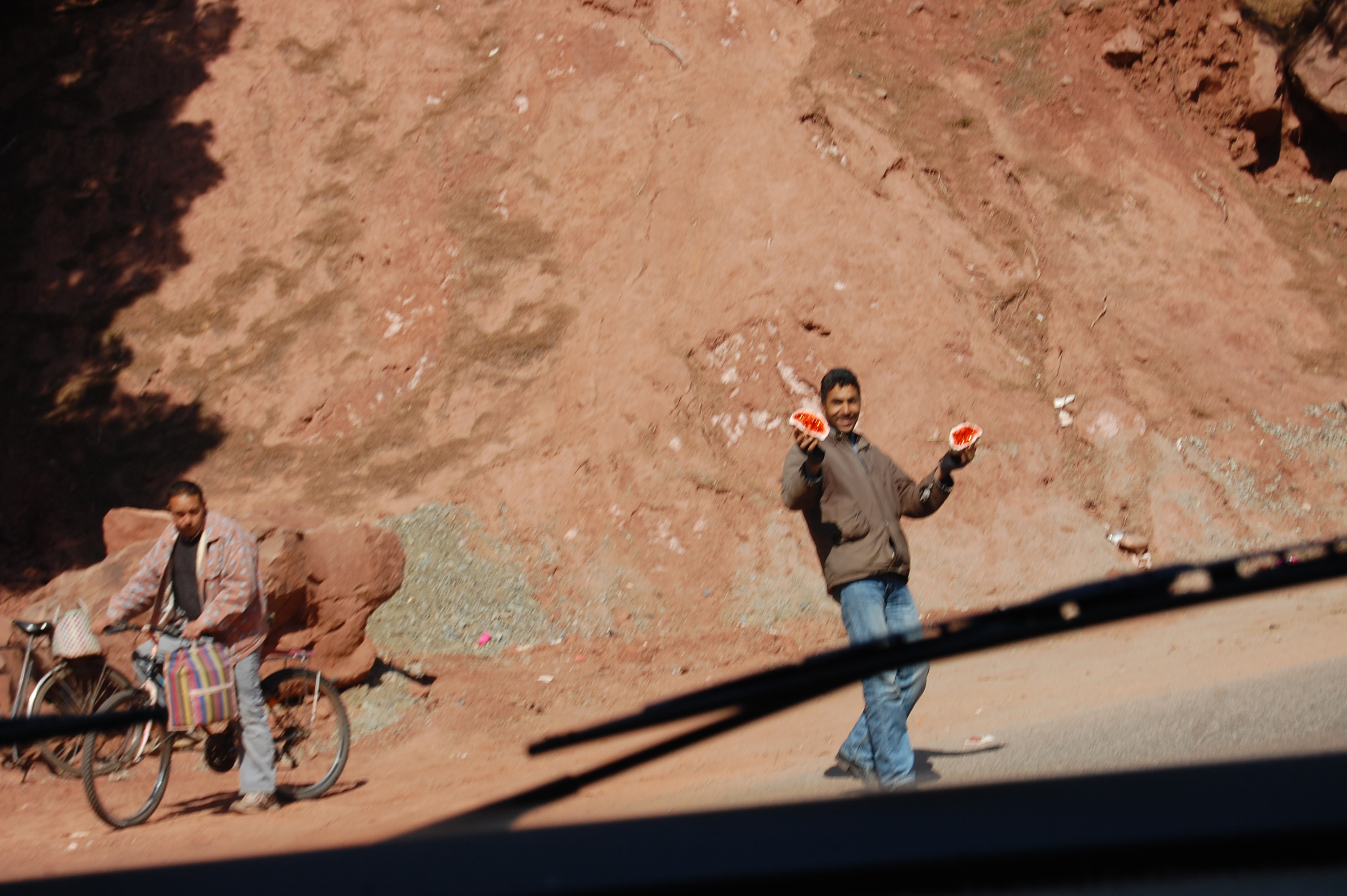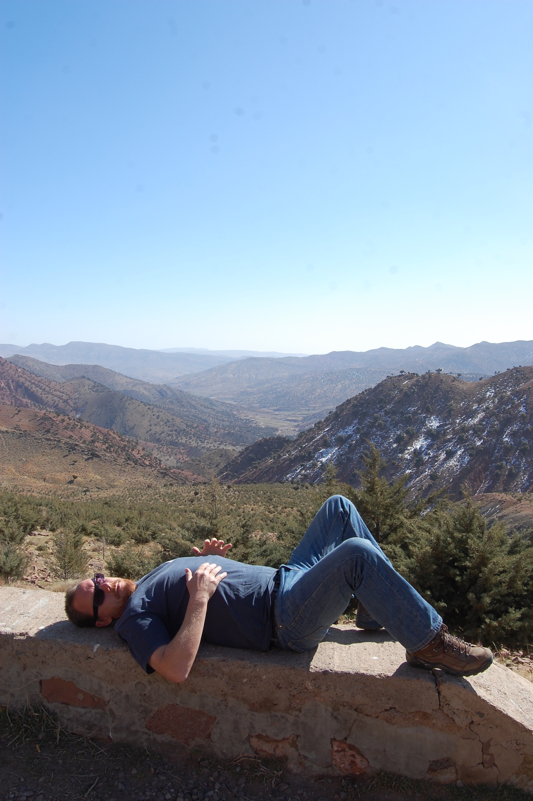 We were on the Tizi-n-Tichka (Tizi-n seems to be the word for a pass as there are quite a few of them) and the views on the drive over the mountains were amazing. The road itself was majorly twisty, so much so that J got really bad pains in his shoulders when we were just over the top of the pass, so we stopped for a bite to eat in the vans in one of the few lay-bys that we could find which weren’t occupied by someone trying to sell fossils or general tat.