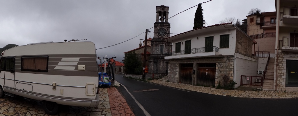 Dave the motorhome isn’t sure what’s hit him, after basking in heat at the warm Greek coastal resort of Katakolo, he’s now being rained on in the cold, cloudy hill town of Lagkadia (N37.68266 E22.03191). His heating is on as it feels like there might even be snow in the air, although that could be us not being used to the cold – sorry folks at home!