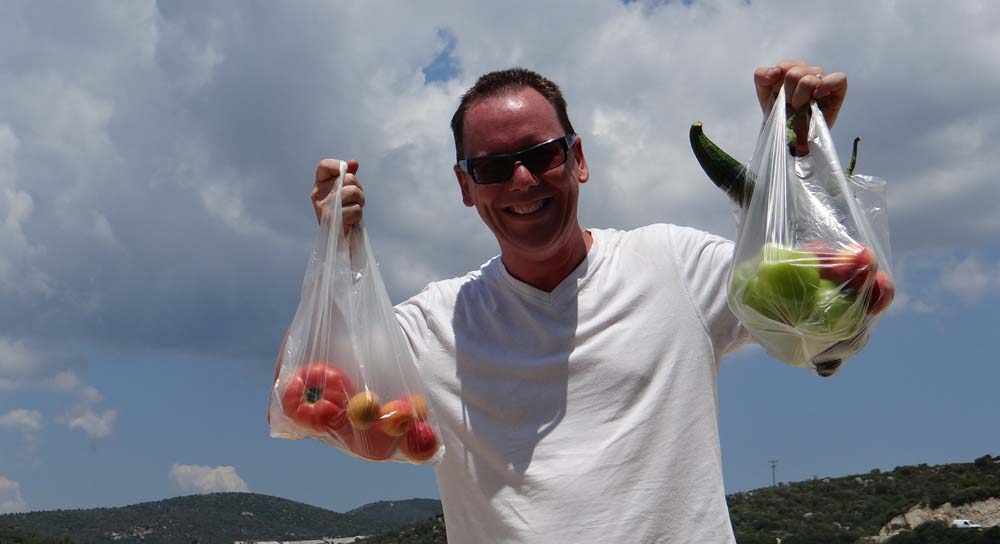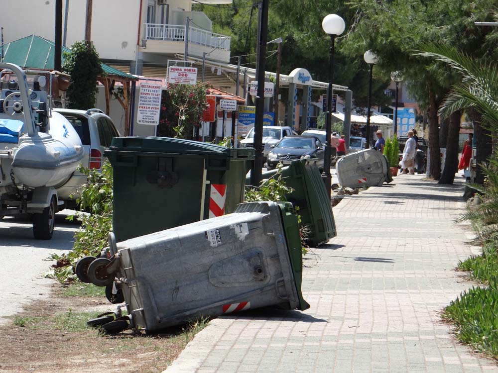 With the sun pushing on Dave’s eastern wall this morning, we decided to have a wander into Toroni before ‘Mad Dogs and Englishmen’ o’clock. I’d picked up a few bits of rubbish from the beach, and adding it to our own stash we headed off. Just a quick aside: most everywhere we’ve been which is organised/rich enough to have some sort of refuse disposal system doesn’t use the door-to-door collection system of the UK. The only bins you see are industrial ones, and you have to transport your rubbish to them. Folks usually use their cars, but we’ve seen some guys using wheel barrows too. Those places which can’t afford a system just dump the rubbish on the opposite side of the street for unfortunates and wild dogs to pick over.