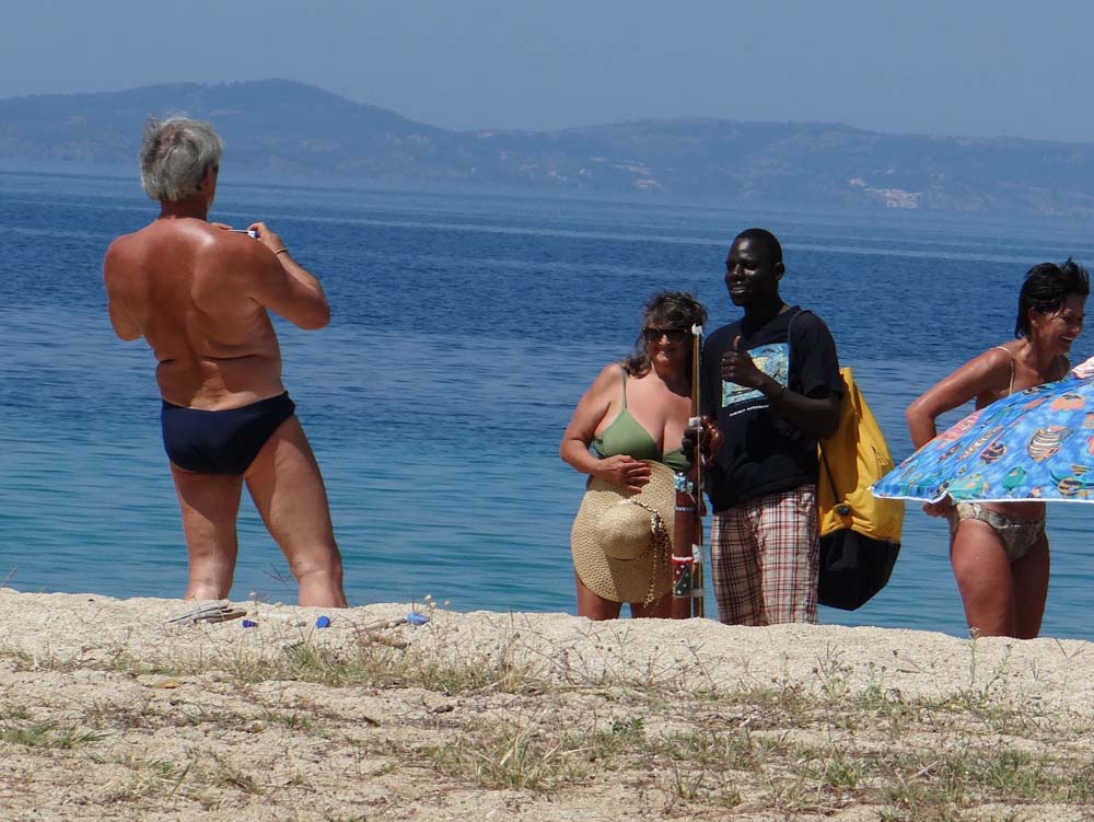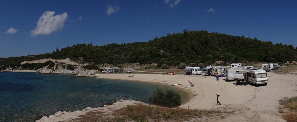 Company! Lots of motorhomes, despite the MASSIVE (and faded) no-camping signs as you enter the peninsula. We guess they went up in the 90’s and since then haven’t been enforced. One van is parked right on the beach in Toroni, which his table and chairs out on the sand.