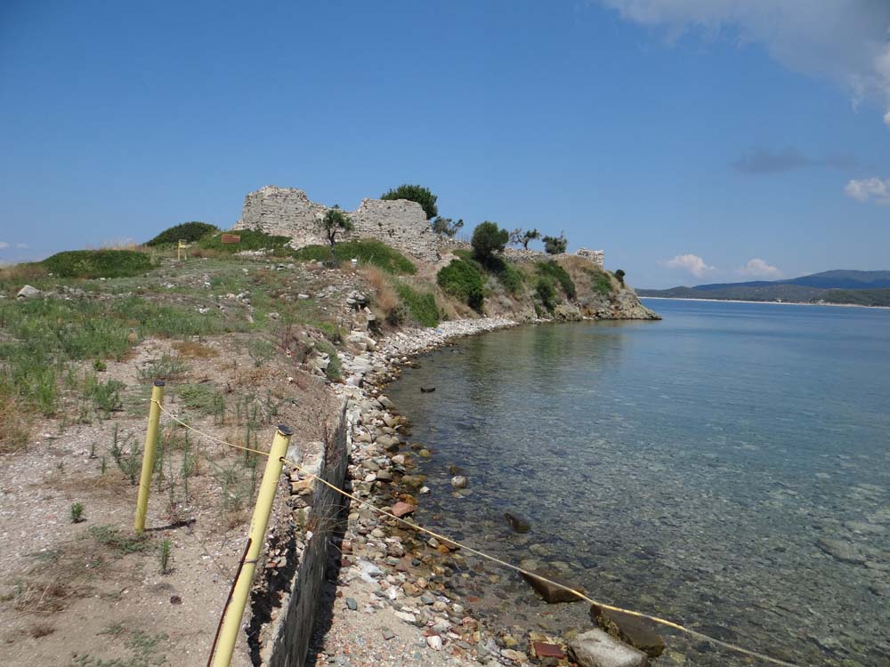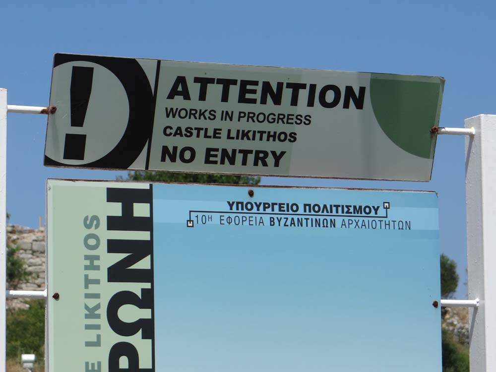 Off down the end of the beach and around the point to where a series of brown signs tempt you along: Byzantine Fortifications, this way. Our couple of months here have taught us not to get excited, even the biggest of Greek archaeological sites is underfunded and has been for years, the smaller ones are mostly locked up, as was this one.