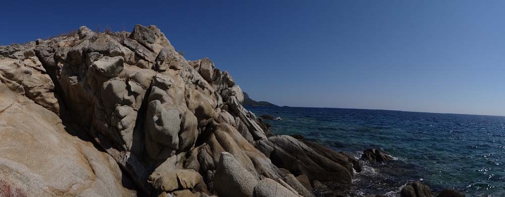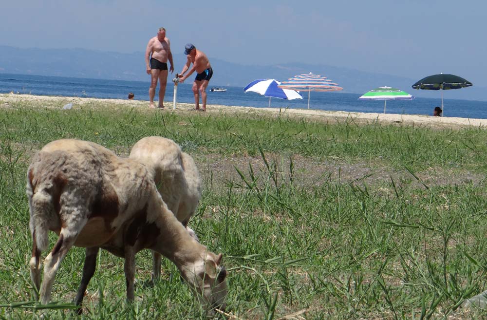 Walking on through the town, the place is hard to describe. With each few meters the scene changes, one minute a shuttered, modern villa in cream with shining metal fittings. The next a derelict campsite. Further on a low-rise apartment complex complete with real, green, lush cut grass. Past supermarkets modelled on the Tardis (extending half a mile back into the hinterland, complete with a chiller full of chocolate), tat shops flogging spear guns alongside beach towels and a pleasant patisserie, and around the corner a shepherd whistles his flock of sheep into a ball as they scuttle along the road. There’s no development on the beach side of the road, it’s been banned, so overall it’s a bit of a dishevelled spot, but hardly spoiled.