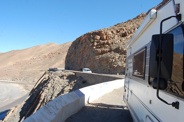 Hi Mike. It’s not been that warmer here, although now we’re down from the mountains it has warmed up. We even had about 60 seconds of rain last night! The scenery coming here was just stunning, with palm groves and little orange box clumps of houses popping up as we rounded the bends. Dave’s windscreen was like a 180 degree cinema screen, just what he was made for. We got up and watched the sunrise coming up over the dunes today. We’re parked in another incredible place. Life’s good. Take it easy in the snow fella. Jay