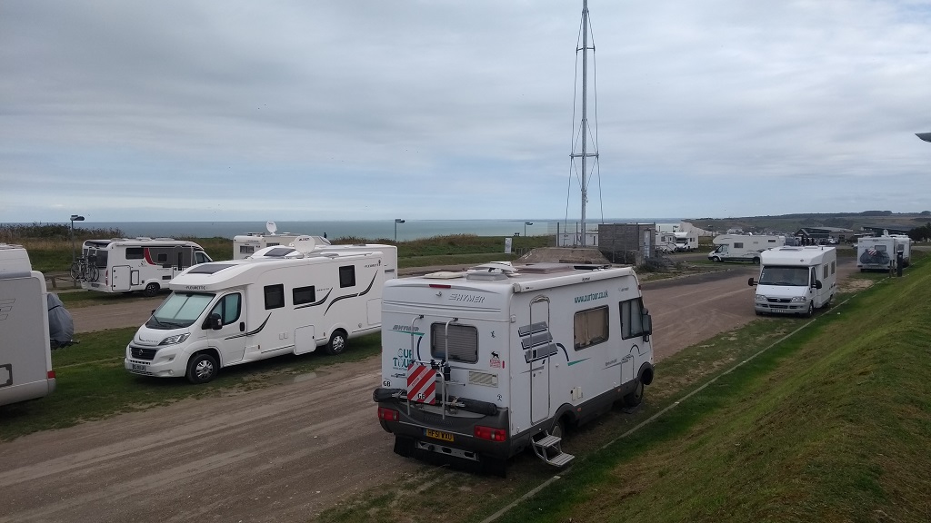 Zagan the motorhome’s steadies are down folks. We’re face first into the wind coming up over the white cliffs of Le Tréport, a fishing port with a hearty chunk of industrial stuff slap bang in the middle. The town’s clearly been having a good crack at attracting the tourists too over the years, and we’re enjoying their efforts by being parked up in one of the town’s motorhome aires at a mere €6.40 a night, with freebie funicular rides thrown in (N50.05822, E1.36319).