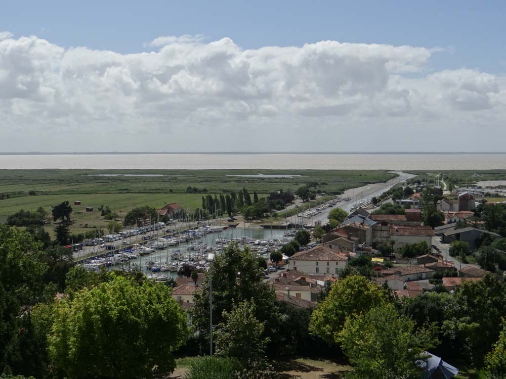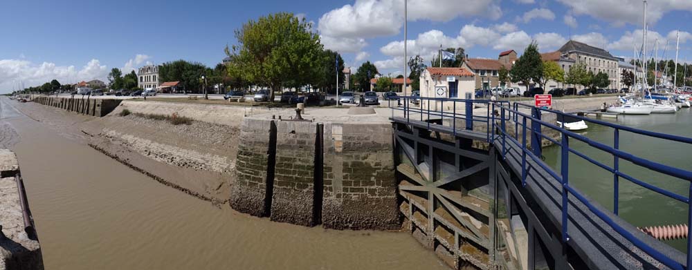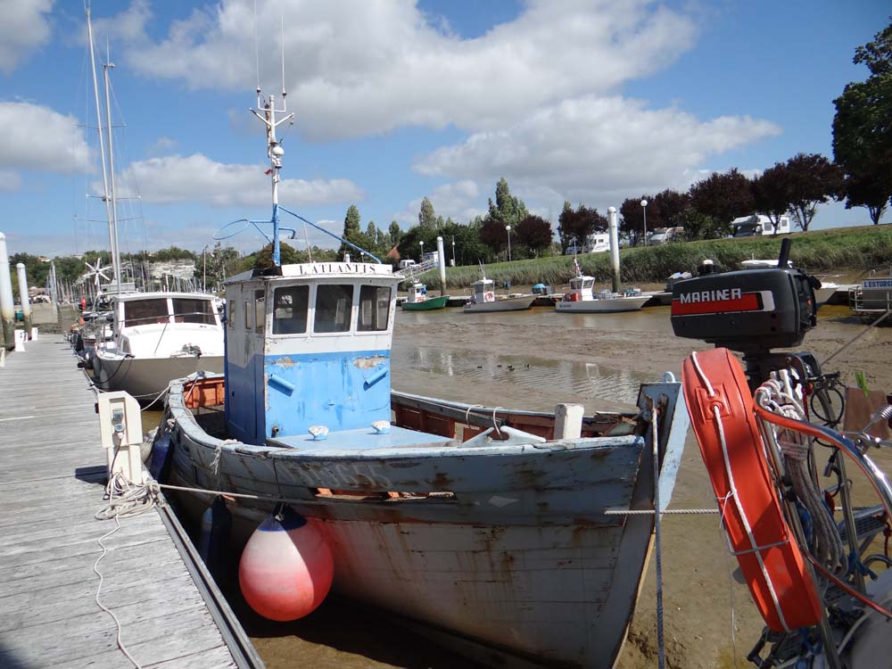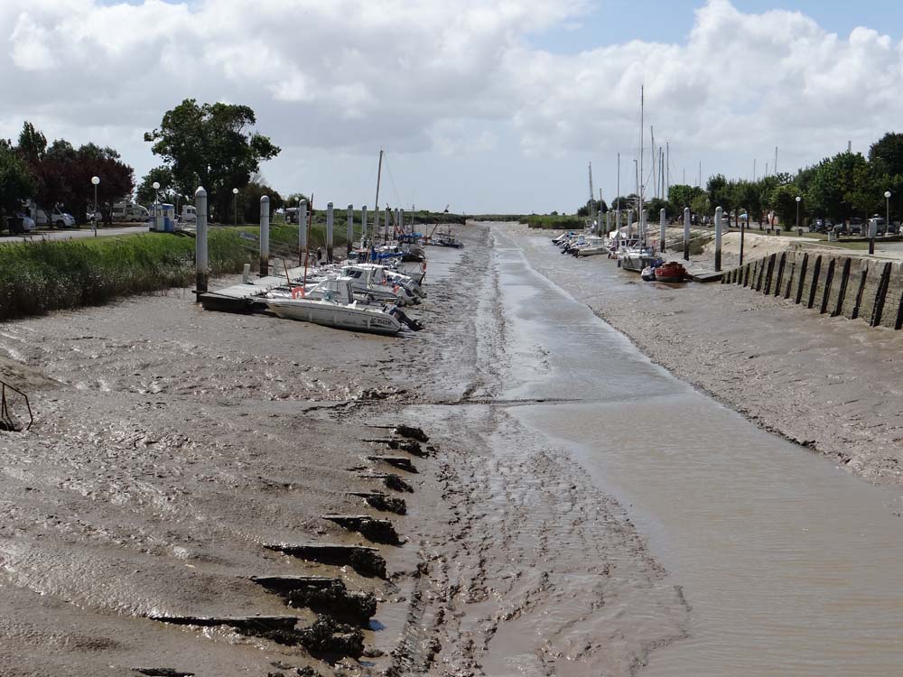 Boats moored up outside the marina rest on mud. The town used to be an important port, exporting cognac, pineau and wine. Destroyers came up the channel to moor up until 1914.