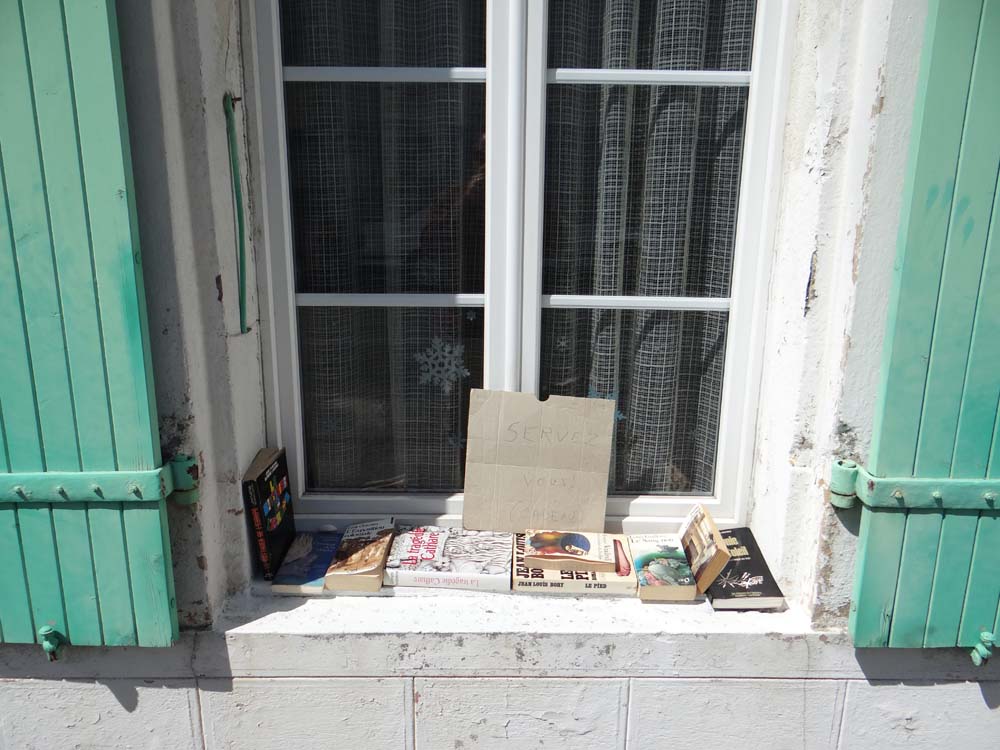 The sign says ‘help yourself’. The next window ledge also had free books and a sign which read ‘a present for you’.