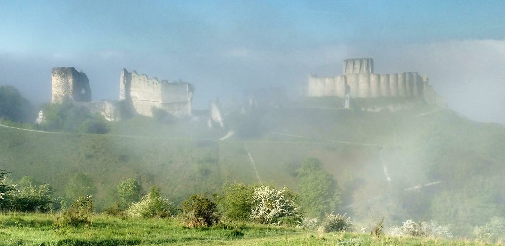 After a fitful night’s sleep for both of us (we really need to get braver on free camping again), we woke in the car park for Chateau Gaillard to find ourselves surrounded by fog. Even if the local youfs had paid a visit last night, I’m not sure they would have seen us. Not fancying driving up the hill out of there with such limited visibility, we chilled out with late breakfast and a brew. As the fog began to lift I wandered out for a final view of the chateau, to be treated to it emerging from the clouds like something from a film.