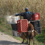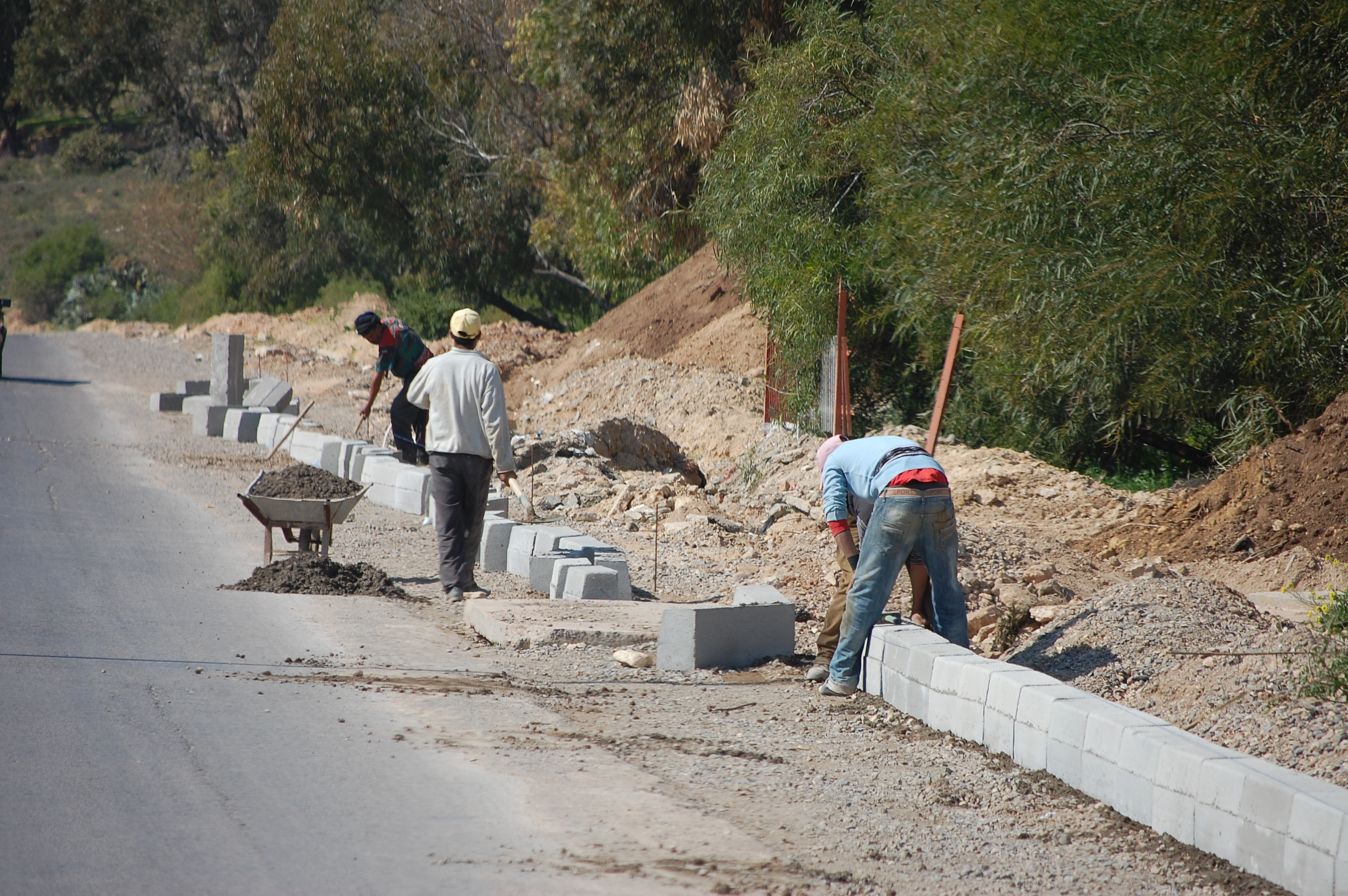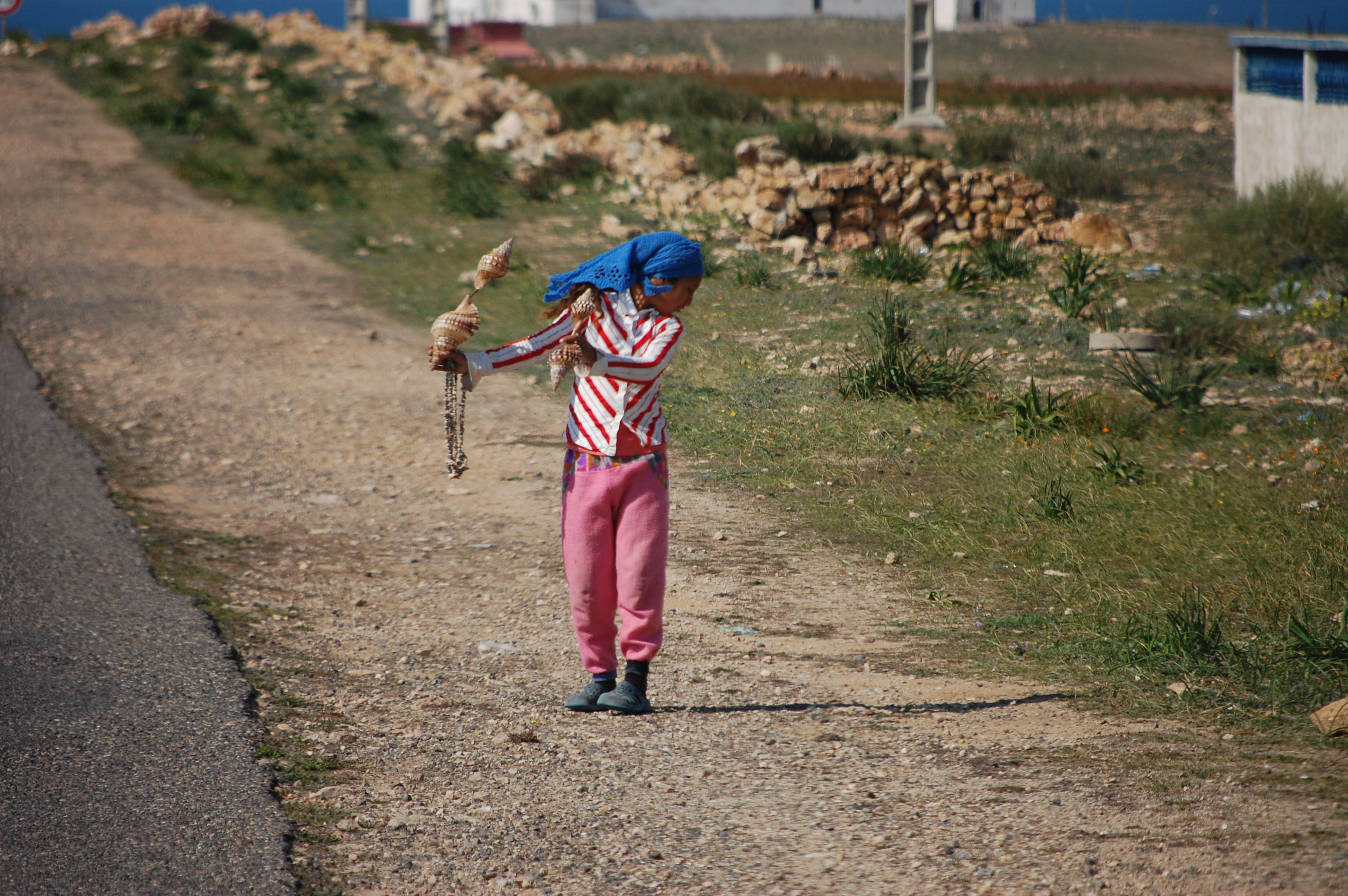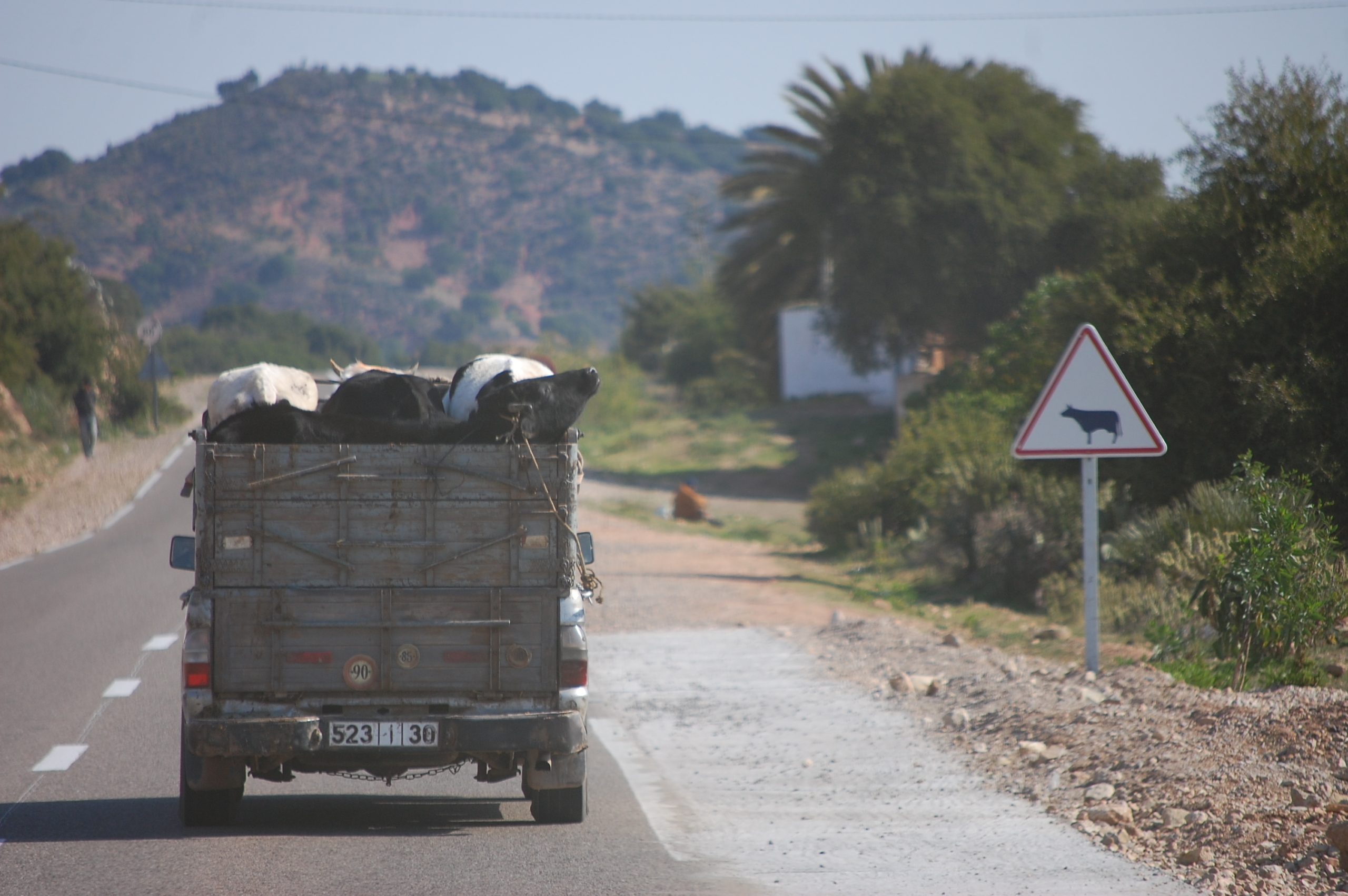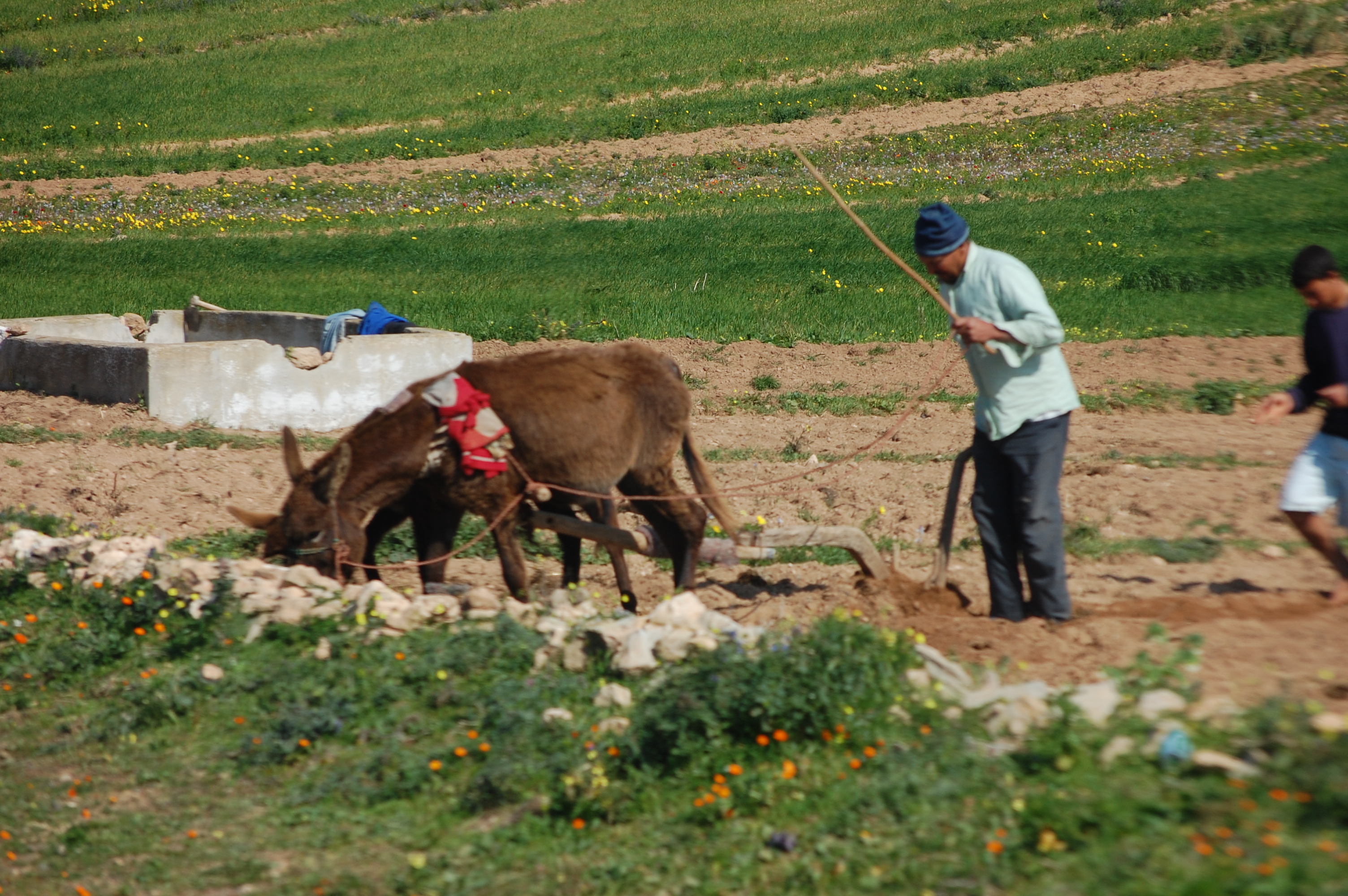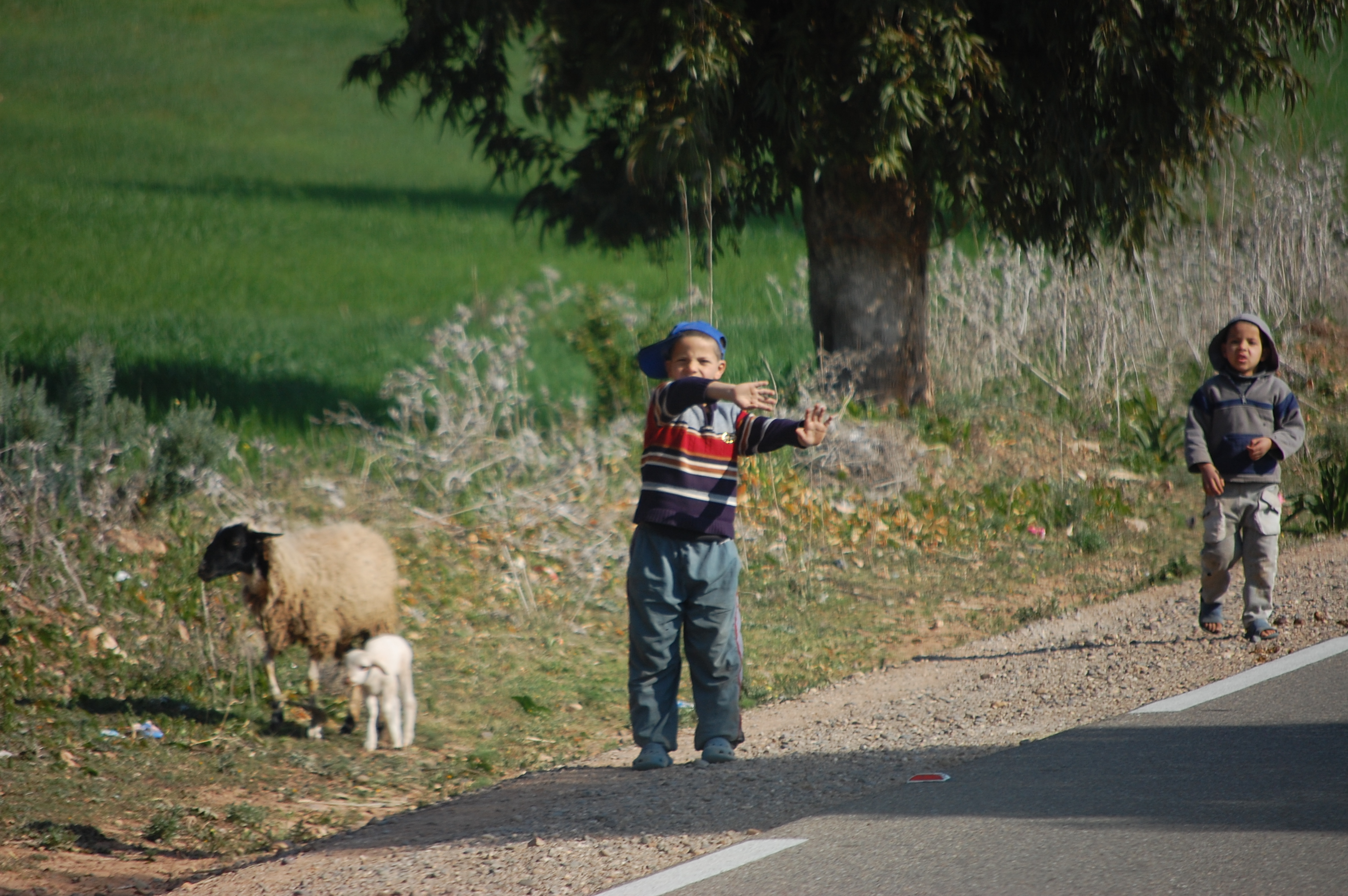 Driving solo, we made our way North through an agricultural area. The fields as far as you could see were ploughed or growing crops, and the odd polytunnel made an appearance. However the people working the land were still doing so with wooden ploughs and animals, and lots of children were working as shepherds watching the sheep, goats and cows, or ferry stuff around on a cart pulled by a donkey. They wave wanting you to stop and give them bon-bons or dirhams – we can only wave back and smile as there are so many of them. At one point we did stop to see if we had run over a chicken (and sneakily open the grey water tap slightly so it dripped out as we went along because the last campsite’s drain was full). We were in the middle of nowhere, fields as far as you could see. Then on the horizon three heads appeared over a hill, then arms started waving. They soon worked out that we’d spotted them and were off, so changed direction and headed towards the road to head us off – you have to give the fellas top marks for determination.