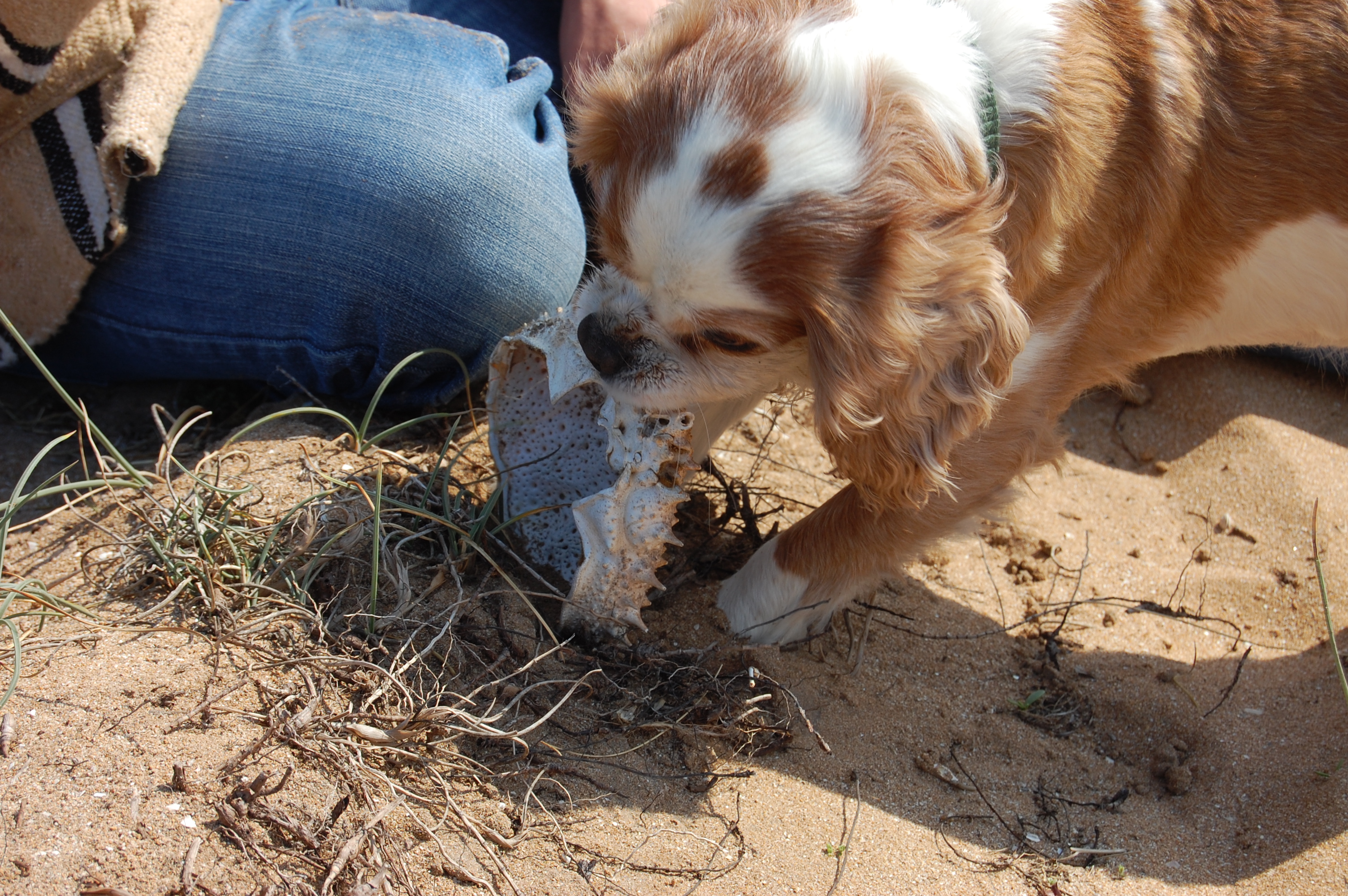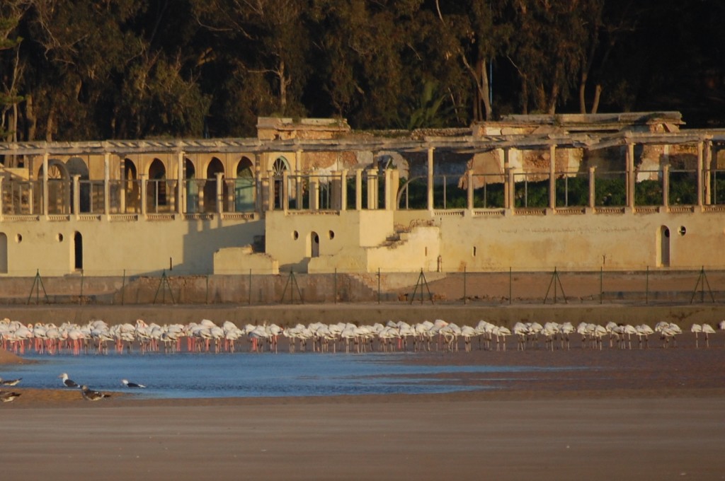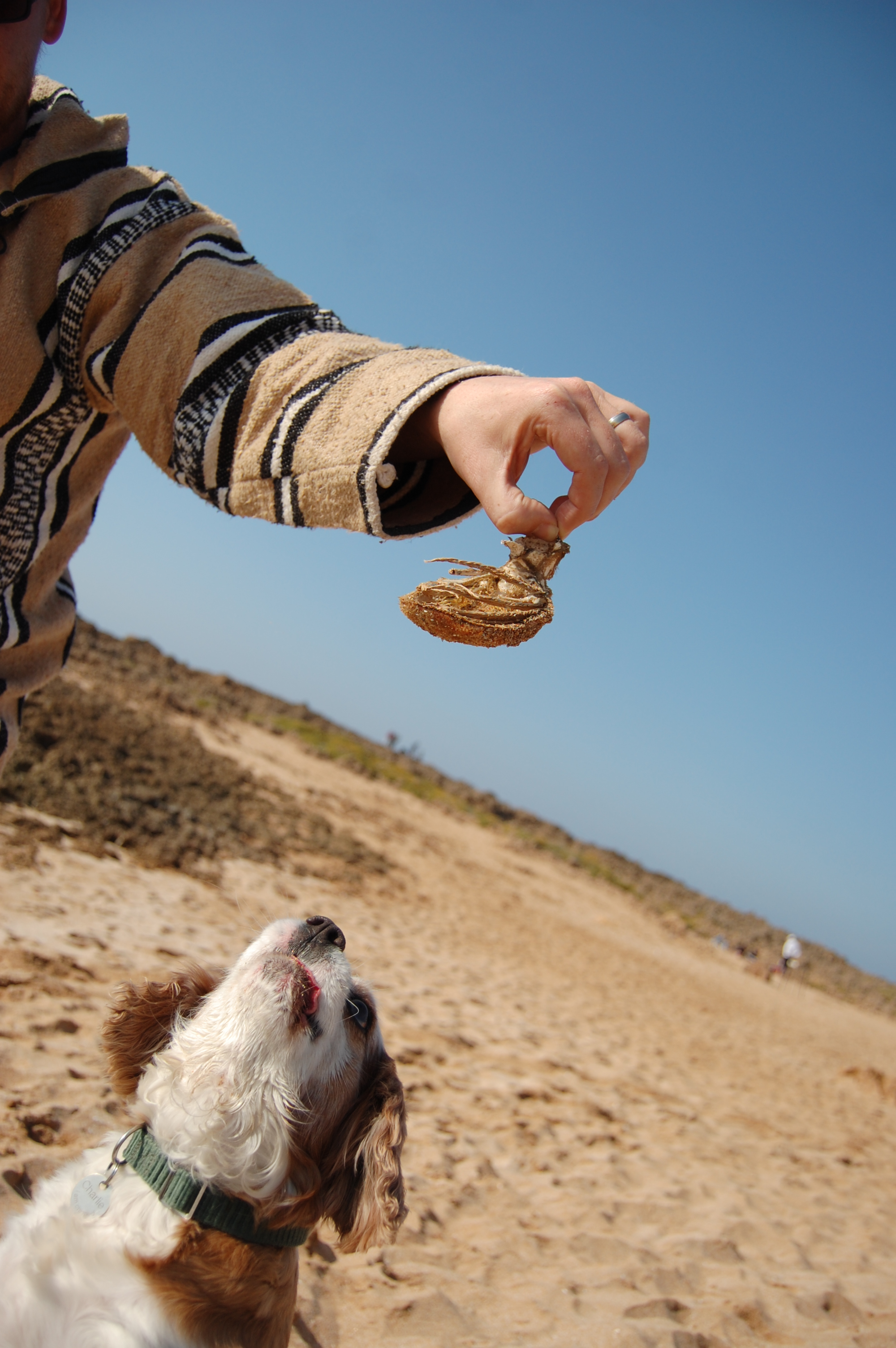 Finally we reached Oualidia and turned left down a small street which took us to a nice clean “European looking” square with a car park behind it with around 20 motorhomes in it. This guarded parking is only 25dh a night (there’s even a sign at the entrance telling you the prices). We went for a walk around only to discover that just the other side of the square is a huge lagoon where you can take a boat trip over to see the flamingos!! We declined and instead walked around the corner onto a huge beach where locals were fishing off the rocks then cooking their catching on BBQs in the sand. Some even had little tables set up under umbrellas – and what was refreshing was it was for themselves, not to sell to us – well only one bloke tried to sell us cockles, but J will only eat them if he’s found them himself. Charlie on the other hand will eat anything, and today was no exception. Crab shells and legs were his favourite, and the locals had left plenty of those for him to snaffle.