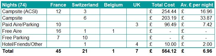 Below is breakdown of where we spent our nights in each country (the £10 spent in the UK was for the farmer who towed us off the festival site with his tractor – he didn’t ask for anything, but we were sure he had better things he could be doing!) The ACSI campsites are part of the Camping Card out-of-season discount scheme – well worth looking into for a camping holiday in Europe.