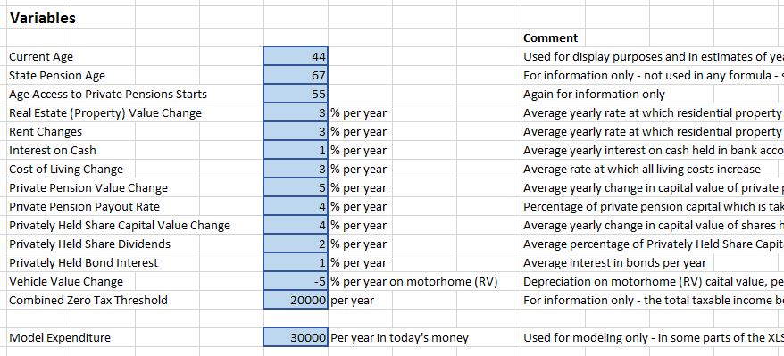 - The Variables tab holds some of the things which will influence financial position long term – like cost of living increases and changes in the market value of properties. These are all, of course, educated guesses, nothing more – feel free to put your own ideas in there and see how they affect the rest of the spreadsheet.