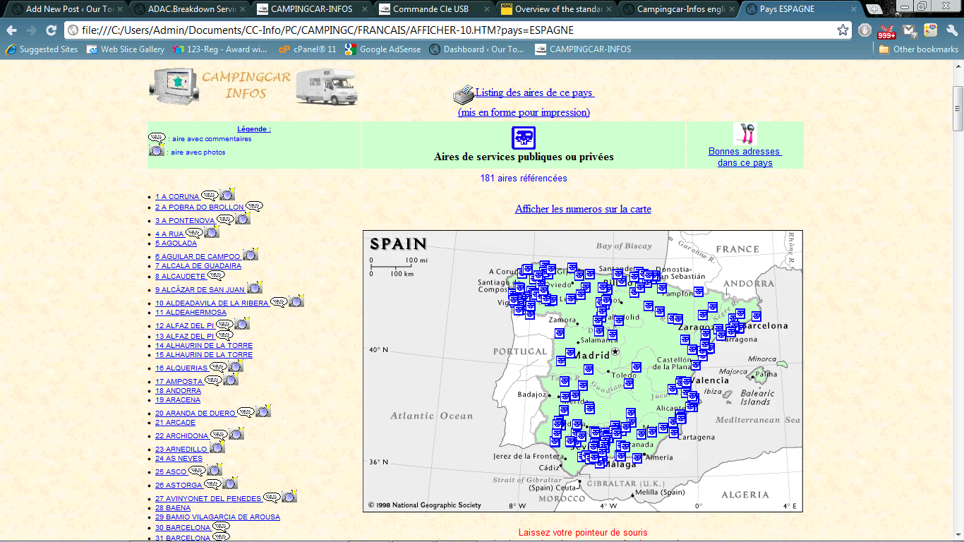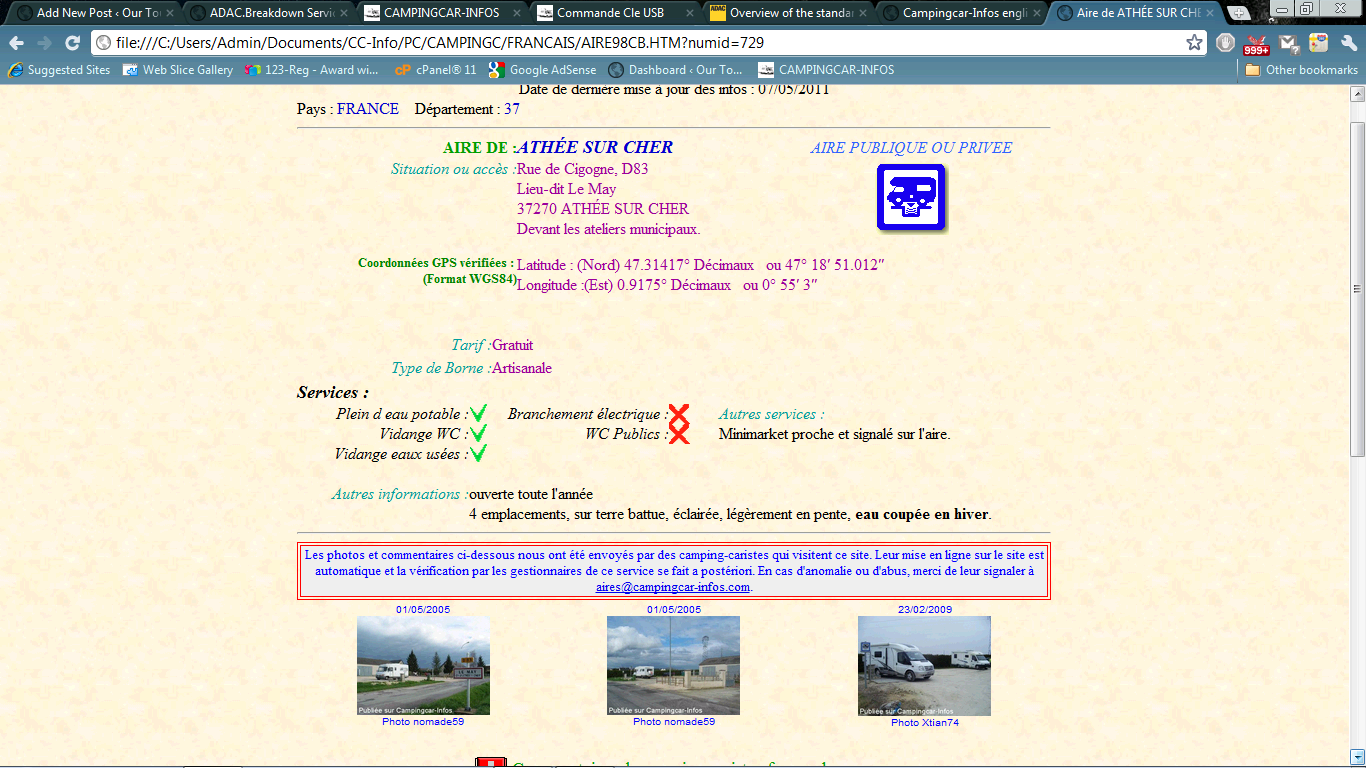 Thanks to Ryan at Do Your Dream, I’ve coughed up the princely sum of €8 for an offline copy of the entire Camping Car Info database. OK, the online and offline versions of the website both need some serious design work (see screenshots below), but they’re an excellent database of aires throughout Europe (6153 of them in France and 8522 ‘abroad’ from Albania to the Ukraine). Most aires have photos and reviews attached, so you can get a real feel for how good or otherwise they are. It’s all en francais, but we can get the gist of it, and it’s good learning material!
