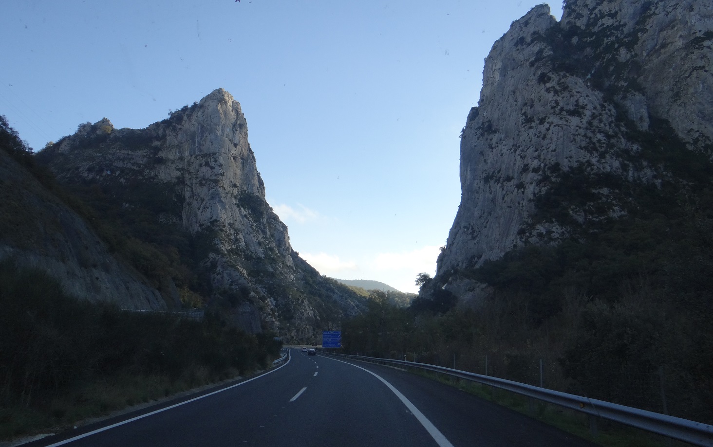 Stacked to the gunnels, we rolled off on the free motorway south, awash with sunshine and with a rendez-vous lined up with Alec and Kathryn in Pamplona. The Basque area of Spain must be famous for its lack of flatness. Although we’re way south of the peaks of the Pyrenees, the land refuses to lie down. No switchbacks in sight, but the road instead opted to simply grind away directly uphill and down dale. Lorries painfully dragged themselves upwards, flashing hazards as if asking for sympathy.