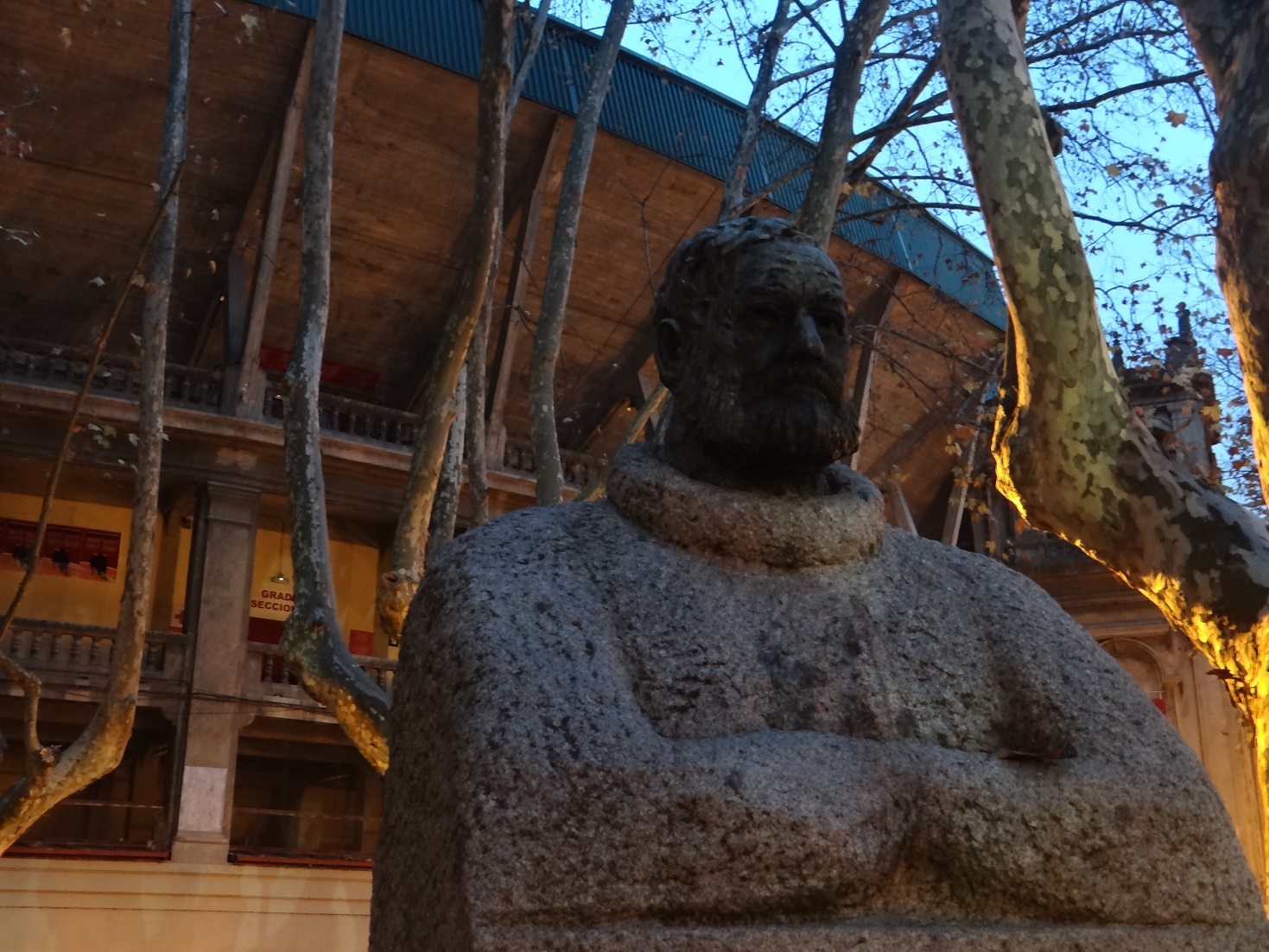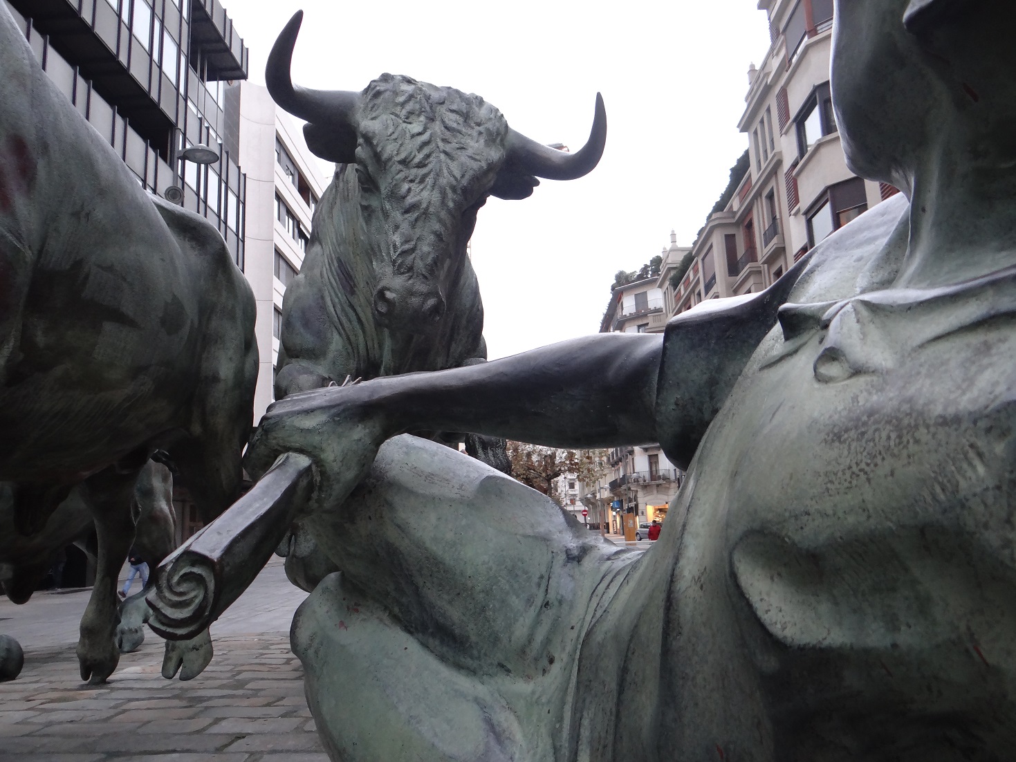 A teeny wee bit more junction jiggery-pokery was required (aka flustered U turns) before Zagan could ease himself to a halt, parked up in front of Bessie in Pamplona. Becalmed again, the three of us strode off with extreme vigour (ahem) into the city, peering about here and there for signs of the famous bull-run. The run (the Fiesta de Sanfermin) takes place in July, so we’re a few months early/late. It’s a tough life, I know. We made do with the town’s fabulous oooh-sheet-the-bulls-the-bulls!!! statue and a drink or two with Alec and Kathryn, when we caught up with them, on the tight street the chase takes place down.