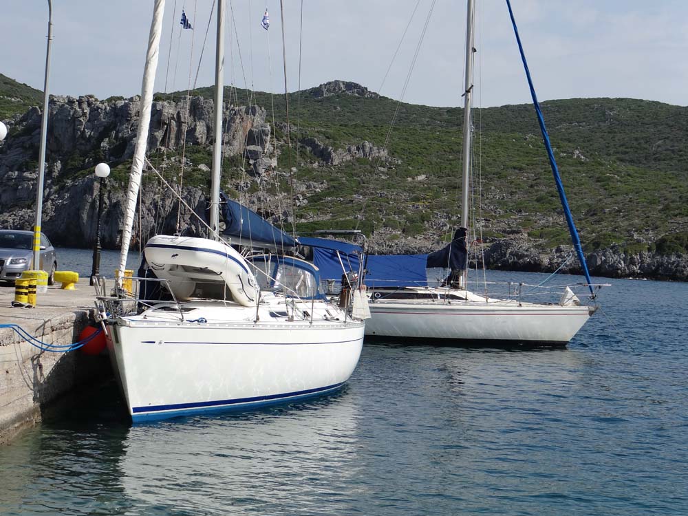 Yachts at Gerakas. The end-ways on one is carrying a young French couple around the seas on a year-out. The larger, closer one has an Austrian crew and was not struck by lightning!