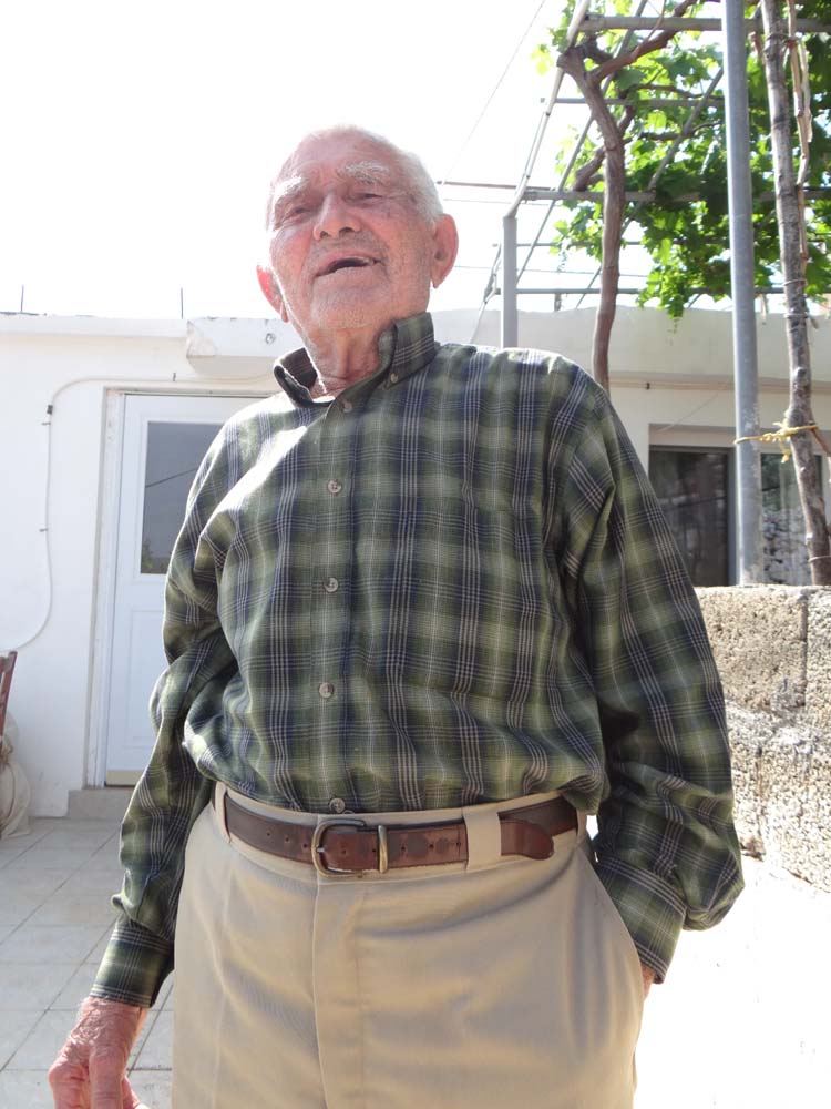 I met a man today who was born amidst this catastrophe. There is a set of steps in the small village here which lead up through the waterside tavernas and into the houses behind and above them. It looks as though it ascends into someone’s garden; we only know differently as we came down that way in our feckless hunt for the brown-signed ruins yesterday. An old man said ‘hello’ to me from a seat angled to look out from his balcony over the sea. I said ‘hello’ back and he spoke some more words in English, drawing me in, but quickly reverting to Greek. ‘I am 92 years old’ he told me. His chest seemed to puff out and he smiled. I never know what to say to this kind of statement, my usual gambit is to make light of it, feigning denial of the truth. I tried this, but he just laughed it off. Over the course of a few minutes of mime, my atrocious Greek and his broken English he told me he’d been a fishermen here, in the days before engines (mimed rowing). His mother had lived here before him. He’d spent over 20 years in New York, working for his son, doing what I couldn’t glean. I asked if he’d enjoyed his life. He hesitated and I though he’d not understood but he had, he was contemplating. ‘Yes, but not going away’. He’d had to go to the US ten times. Greece is famous for it’s diaspora. This beautiful country has everything but money. I asked if I could take his photo and he looked bemused but said OK. When I tried to show it to him on the camera’s screen he pointed to his eyes, milky with cataracts He’d still a firm handshake though, seeing me on my way with a ‘good luck’.