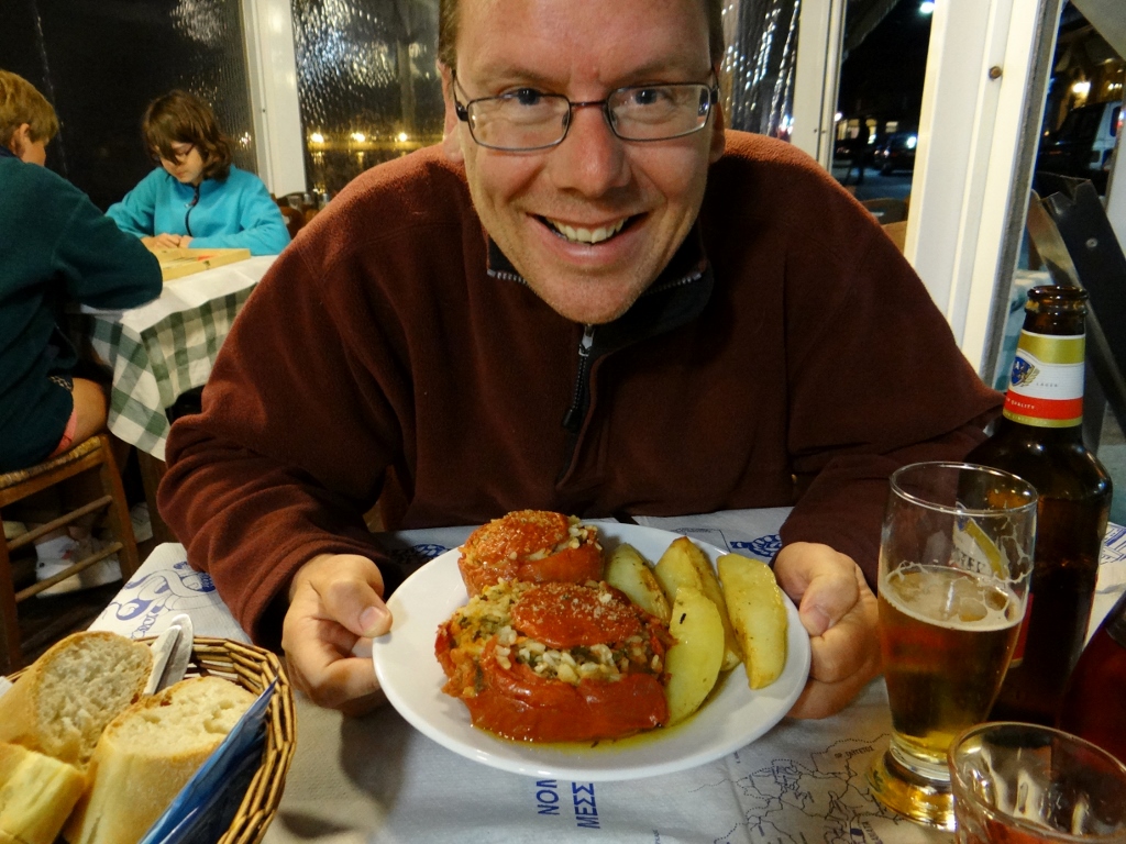 Last night we rounded off our mini-holiday in Koroni with a farewell feast at the Parthenon restaurant – it was the most recommended by our guidebooks, trip advisor and a couple of locals we met. We weren’t disappointed, although we still haven’t mastered the art of ordering here and ended up with way too much – but Charlie is very happy with this as we bring him back the leftovers for his breakfast.