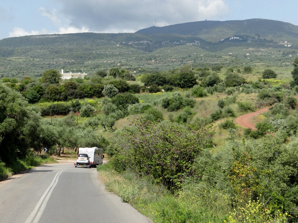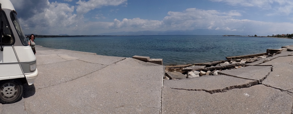 Dave the motorhome is on slightly shaky ground, but has a great view over the Messiniakos Kolpos (a bit of the sea) to the Mani, the mountainous part of the Peloponnese. His kipping spot is on the sea front in the small town of Petalini (N36.95961 E21.92845), to our right the harbour, behind us the main road and shops – three supermarkets, one petrol station, numerous cafes and several agricultural suppliers make up the majority of the potential spending places.