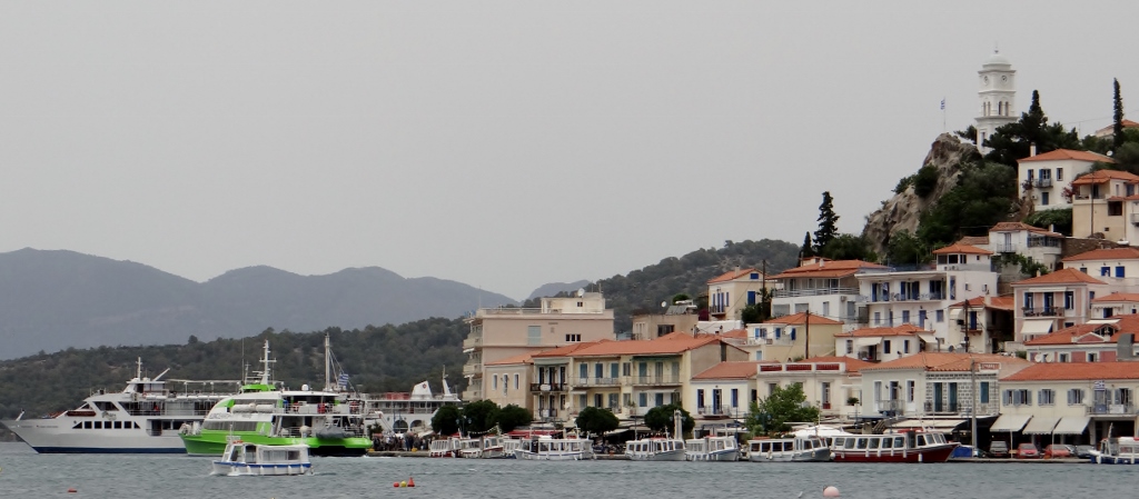 Little blue, white and red hand-painted fishing boats are tied to the rocks on the shore on this side, in Poros the waterfront is lined with big expensive yachts. Two car ferries and a fleet of little shuttle boats constantly cross the water looking as aerodynamic as shuttle craft from Star Trek. I think we’re on the best side of the water as the view of Poros is lovely, it reminds me of St Tropez. I expect that in Poros the view of Galatas isn’t quite as good and everything is double the price. We might try and find out in a bit, as we’re thinking of taking one of the space shuttle crafts over for a Friday night in Poros!