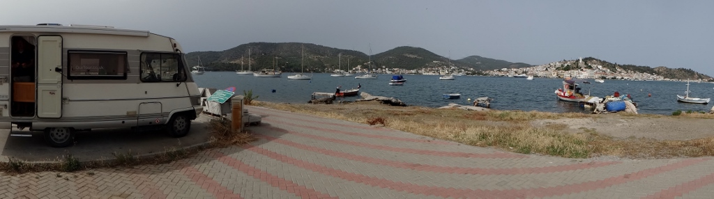 Dave the motorhome might be in a building site, we’re not entirely sure. He is parked up in a red and white plastic taped off area of the waterfront in Galatas, surrounded by piles of sand, pavement slabs and a couple of JCB’s (N37.49871 E23.44544). We’ve been here for a while and no work has been done, so we suspect we’ll be OK as we’re about 250 metres outside of the town (far too far for anyone else to walk) and we have a great view of the island of Poros.
