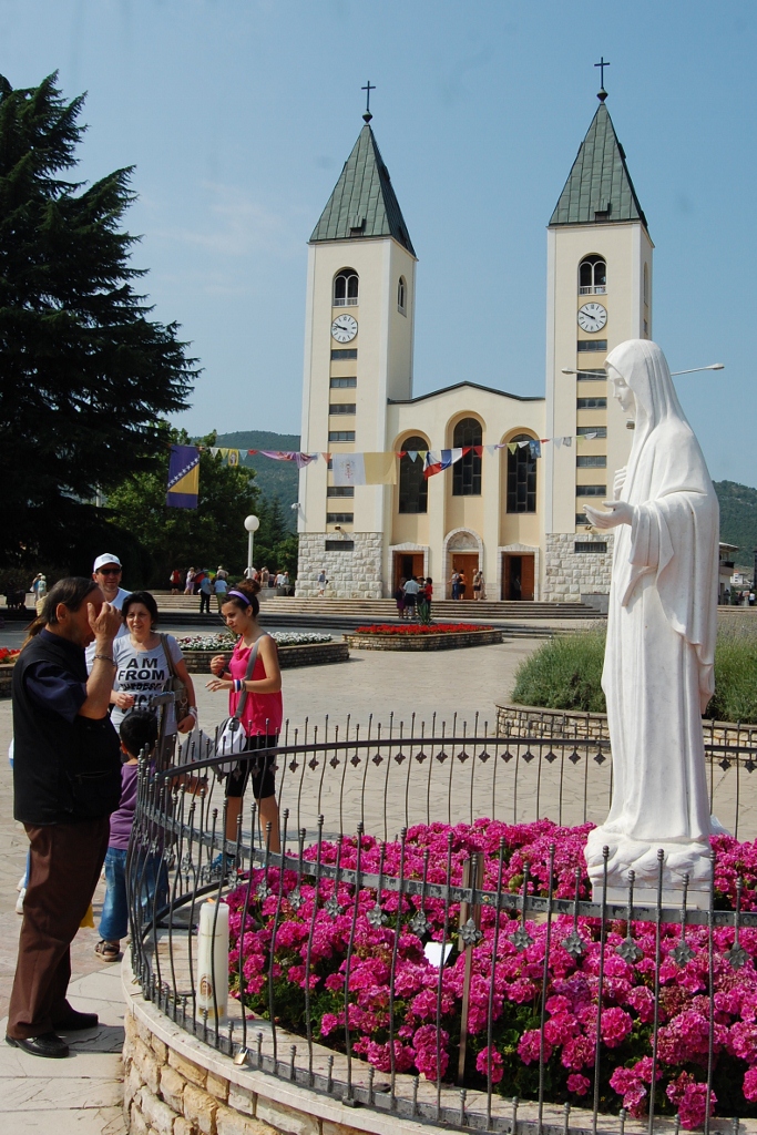 We followed the convoy of tourist buses and road signs, satnav doesn’t recognise anything in this country except the name of the capital city, to Medugorje. We’d never heard of it until we started to research our route, but over 30 million people have visited this small town of 4,000 since 24 June 1981. That was the date when the Virgin Mary appeared to six children in the town. People come here to see her, many of them looking at the sun hoping to see something. This small town is now one of the most popular pilgrimage sites for Catholics in the world, and no longer small, as hotels and hostels outnumber houses, with more being built on every scrap of land. Souvenir shops line the streets selling everything from rosary beads, holy water bottles and fake designer goods to huge statues of Mary and bishop outfits.