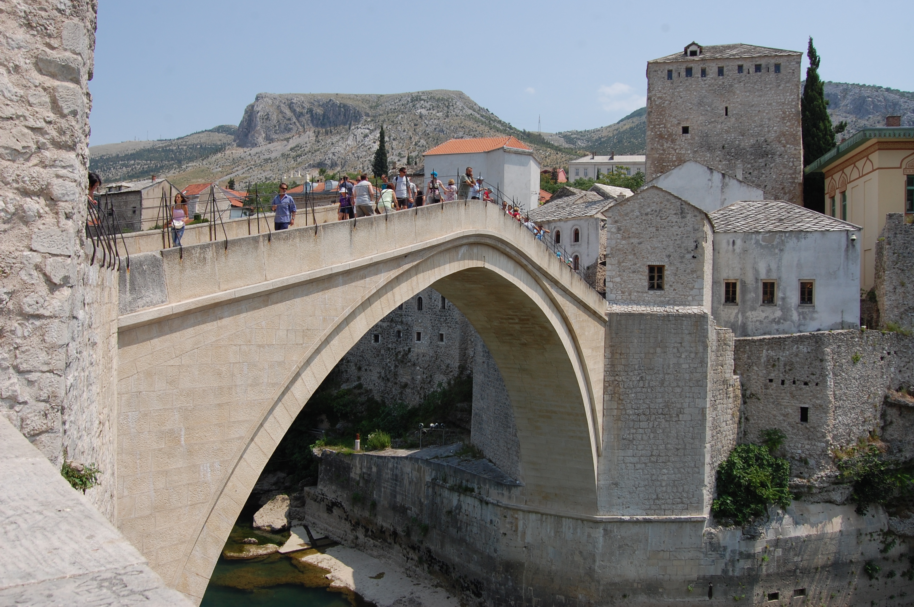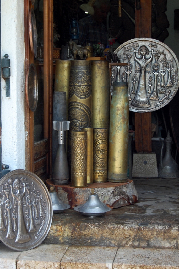 Stepping out of the car park we were faced with a shell of a building, the scars or war here are still very, very fresh. We followed a tour group who had just got out of a mini bus until we spotted a tourist information. A map would be 5KM – I declined, but did get details of a nearby campsite. A narrow lane lined with tourist shops guided us to the bridge, the items on sale reminded me of those in the souks of Morocco – Fes hats and silver tea sets. Calls of ‘hello, you want ice cream?’, ‘Good restaurant, good view of bridge’ followed us as we coerced a reluctant Charlie from shade spot to shade spot.