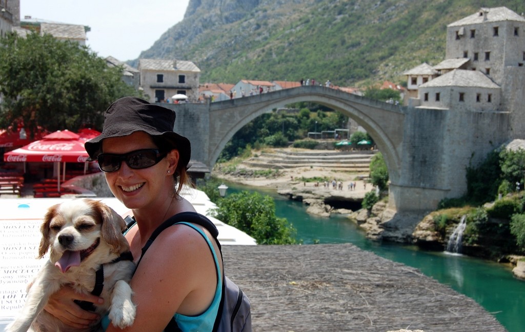 It was now only 10.30am, but so hot that sweat poured off us and Charlie’s panting sounded like he was choking at times. We pointed Dave towards Mostar and set off to create a bit of a breeze. After a few miles the road we travelled along was suddenly on the side of a mountain over looking the town, we wound our way down it stopping where we could to view the skyline of high rise blocks and minarets. Our knowledge of Mostar is limited, as was the detail on our map, so we followed signs for the famous Stari Most Bridge. Just when we thought we were about to reach a dead end, we saw a sign for car and motorhome parking. At 5KM (about €2.50) an hour, we were guided in and sought out the most shady spot (GPS – 43.33758, 17.81145)