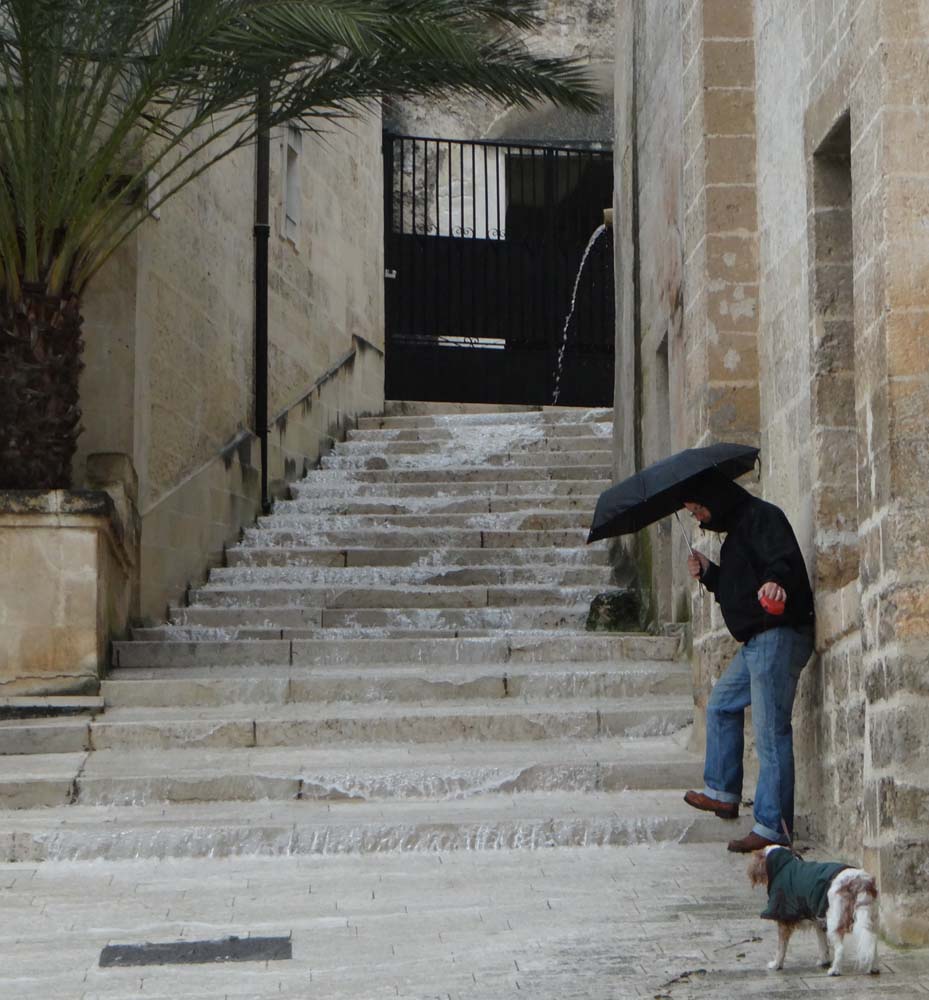 It rained this morning. Good old fat rain. Lightening, thunder, flooded steps up into Massafra, the works. Charlie got a few laughs in his dog coat as we dragged the reluctant mutt along for a quick look around town. The place looked nice enough, but the mixture of hammering rain and grey skies had us outa there sharpish.
