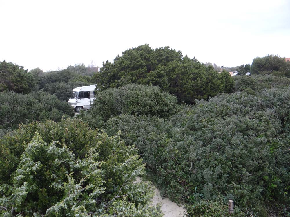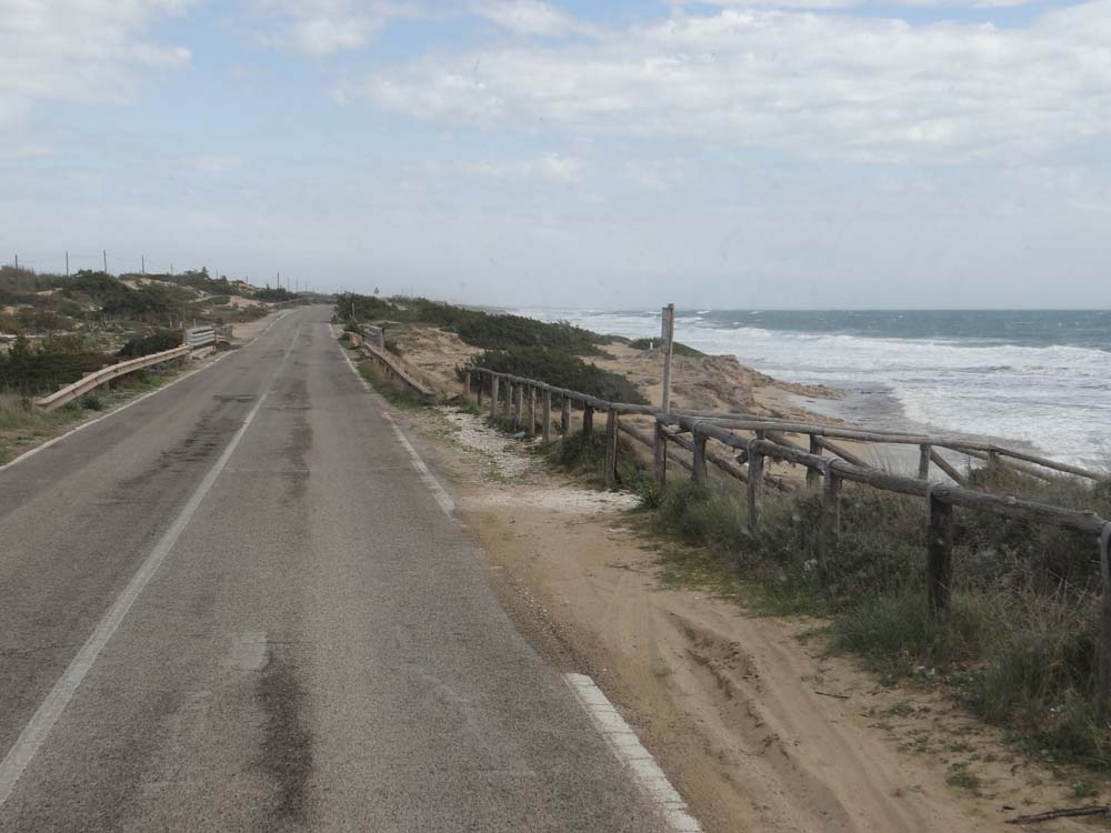 Dave the motorhome has reached the end of the road, sorry, the end of a road. He’s a fat dune away from the beach and an unusually feisty Med on a lonely little beach road (N40.294355 E17.785862), which is near Lido Serra Degli Angeli, on the underside of the heel of Italy. We passed a number of villas on our dead end road here, every single one of them is shuttered shut; no-one is home. Like coasts everywhere, it’s pretty much completely abandoned around here during winter, which makes for easy free camping locations for us, pick a spot, any spot.