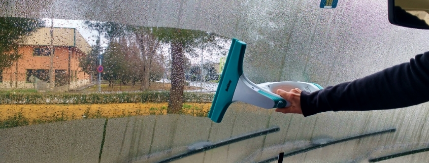 We have an A Class Hymer B544 motorhome and it has one big windscreen! None of the window vacs on the market are specifically targeted at motorhomes, so we were interested to see how it would work on our curved windscreen, where you couldn’t always use it upright.