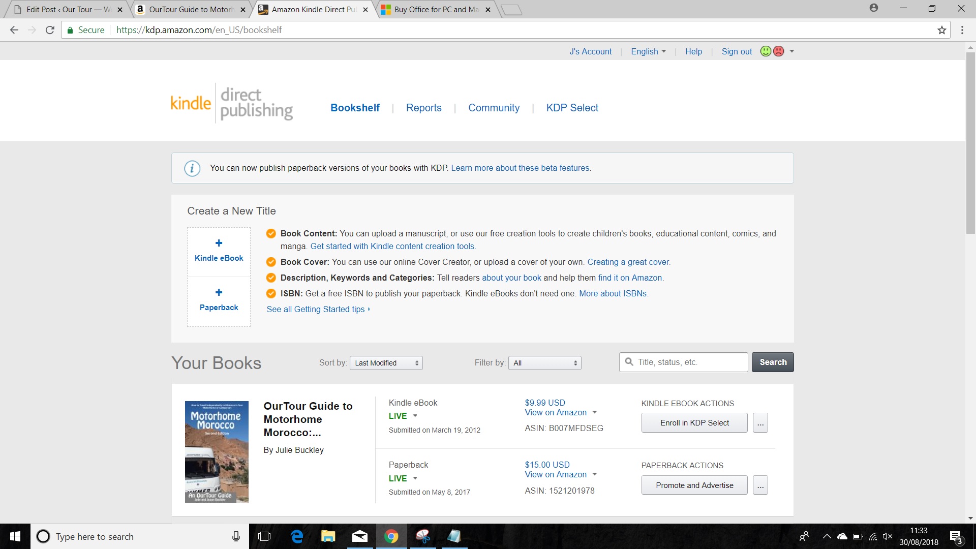 We’re currently working on self-publishing our fifth book through Amazon’s Kindle Direct Publishing (KDP) system. This post gives a brief overview of how we’ve done it and, should you want to, how you can do it too.