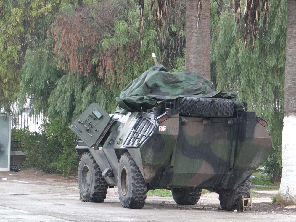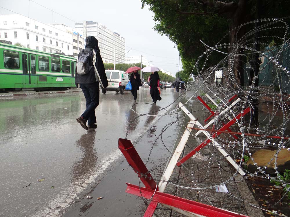 Life on the streets of central Tunis. An uneasy truce seems to exist, with police and army folks sat inside their armoured vehicles as the rain poured down.