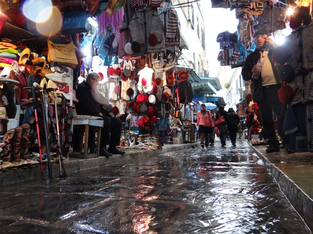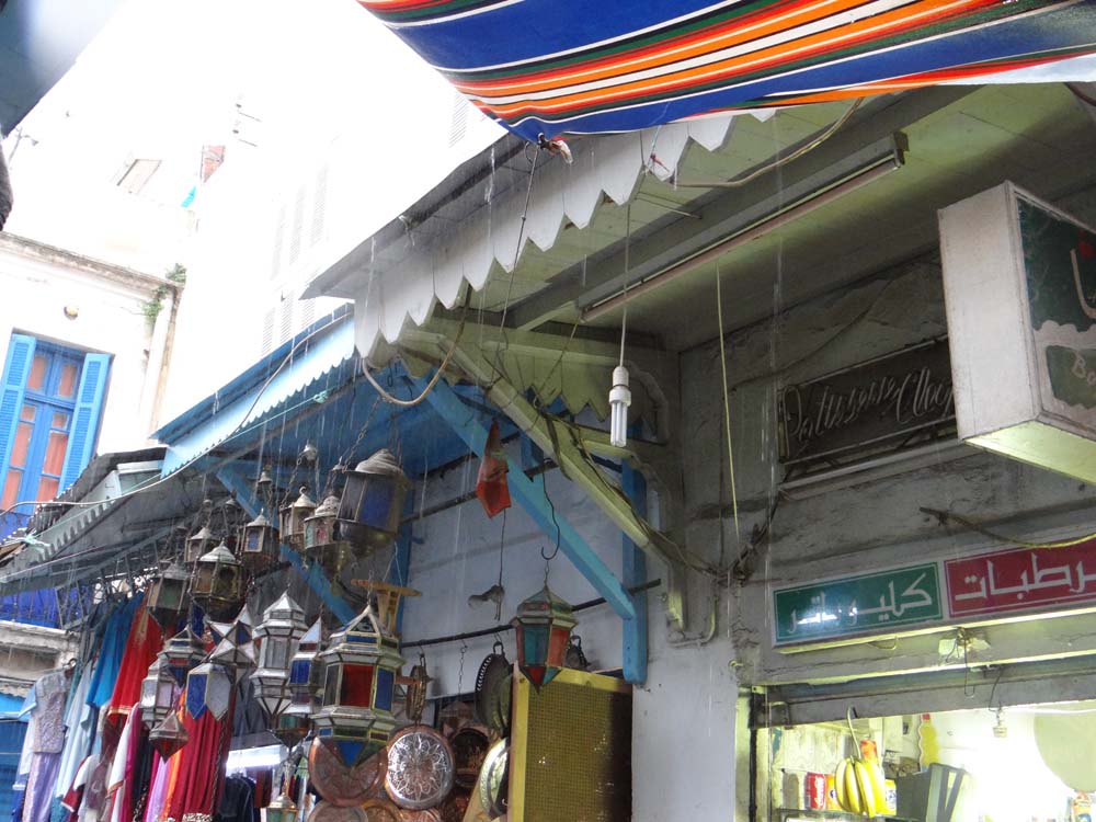 Exiting the museum, a bit frozen in the cool air inside, we’d worked out how to get to the medina. Tunis is, like most North African cities, an old town with a new, French-built bit bolted on the side. The Tunis medina is huge. Last night various scare stories advised: do not go in after dark. They didn’t say anything about going in when it’s pouring with rain though so we jumped off at Barcelone Square (nah, no idea why it’s named that) and headed in, failing to get a brolly seller lower than €2, we pulled our collars higher against the lashing wetness from above.