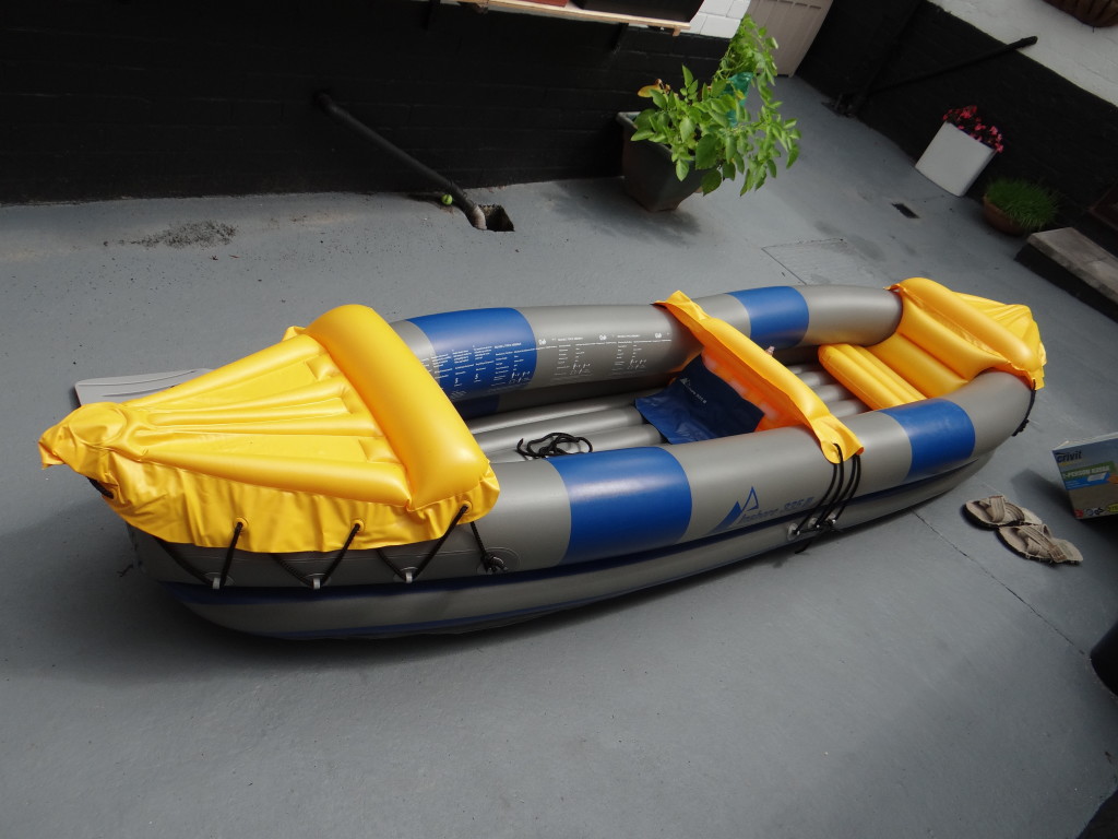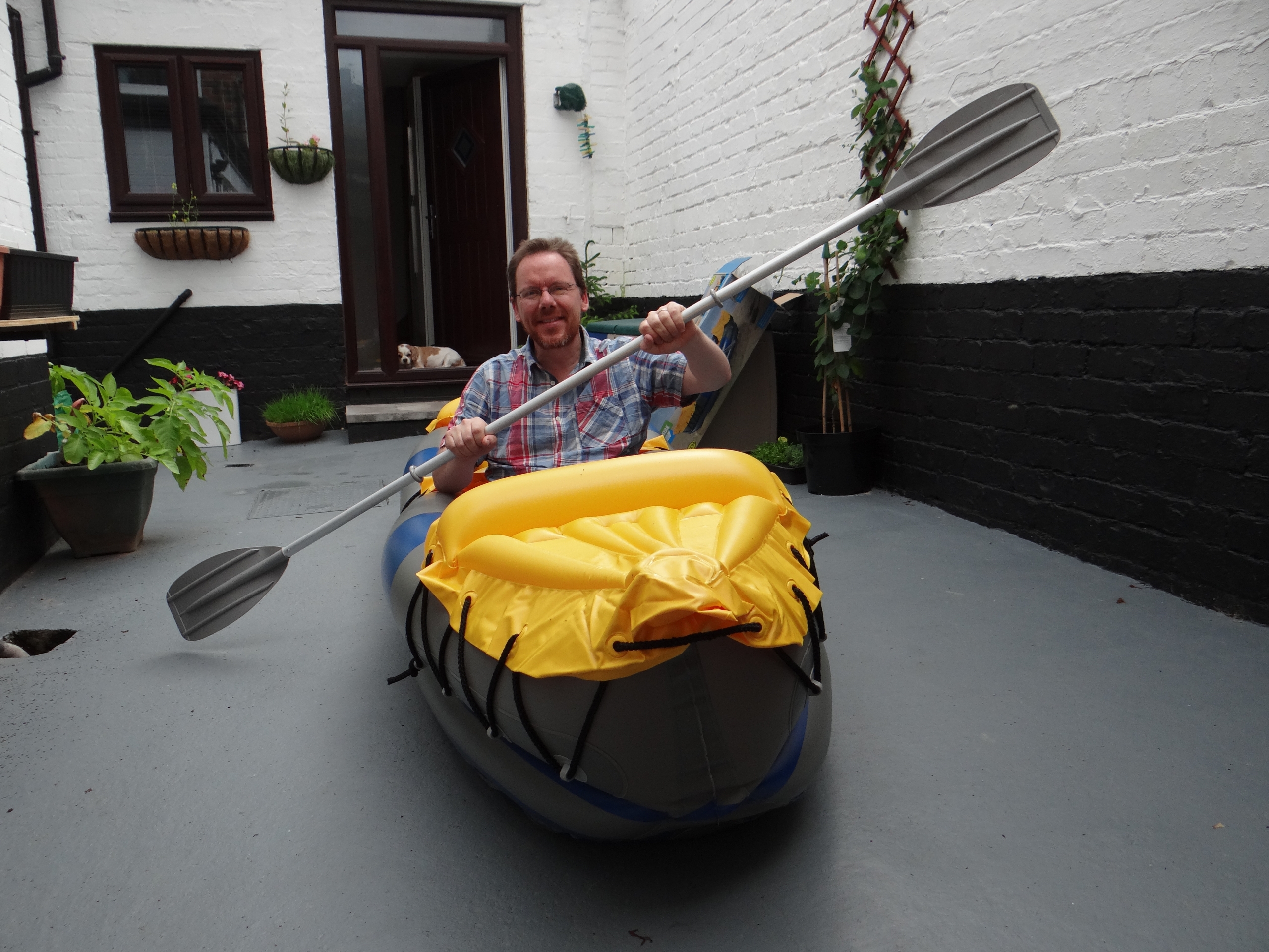 So, anyway, we have an inflatable kayak. I just put it together in our yard and it looks fine for what we plan, just a bit of fun, no death-defying paddling across the channel, dodging tankers. I’ve considered taking it to the local canal for a test, but just can’t be bothered. The water’s a gravy-grey colour. There are rumours of dead cows just beneath the surface (well, there were 35 years ago while I was at the local school). The test can wait for a more pleasant splash about somewhere.