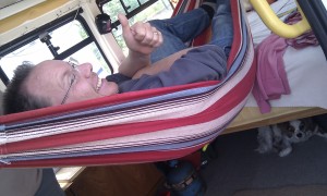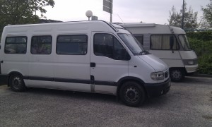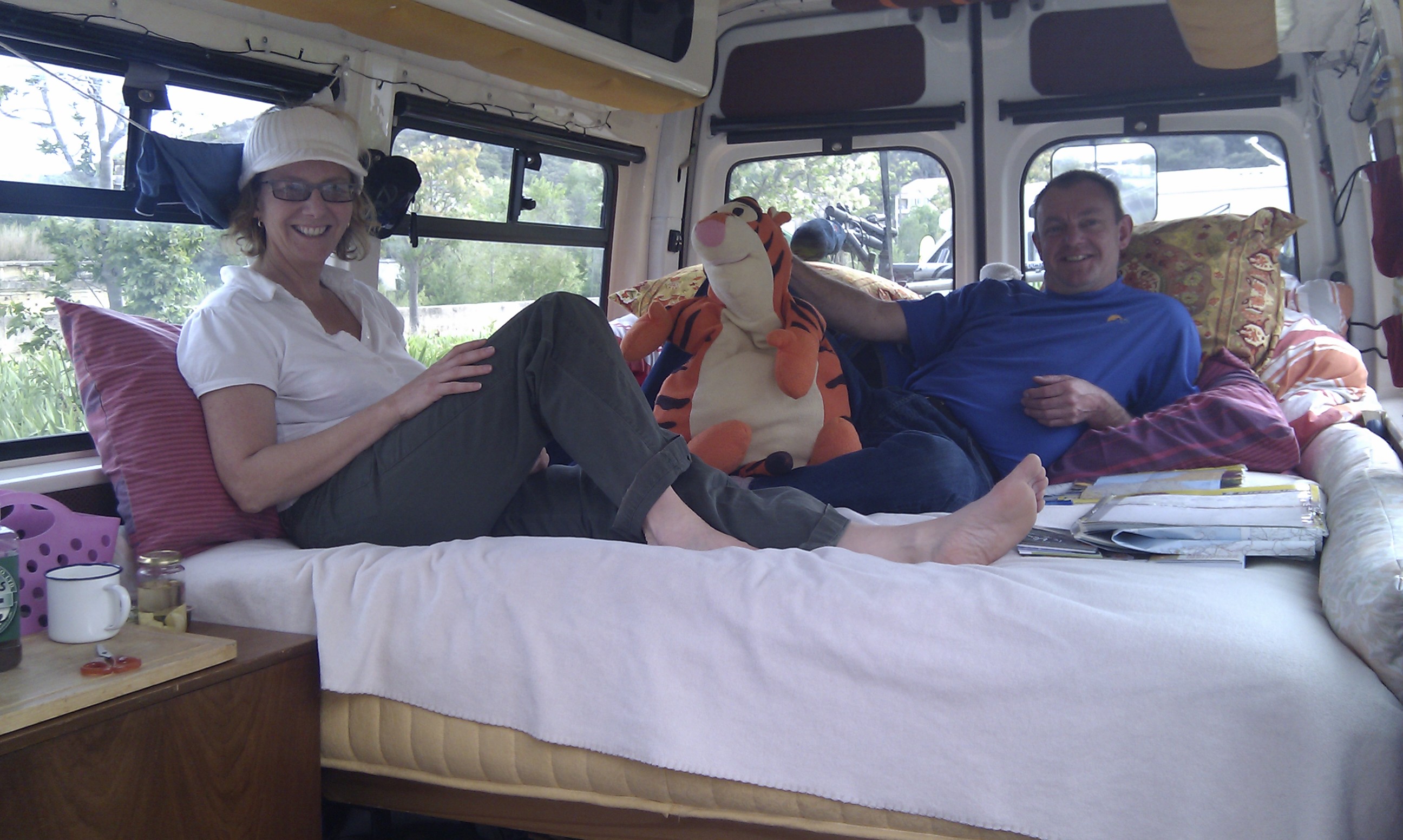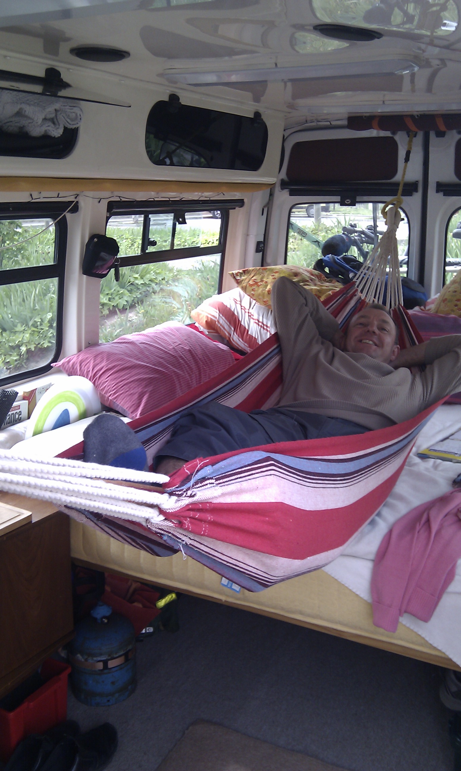 Phil and Julie’s van, an ex Ambulance, is testament to their adventurous spirit, ingenuity and resourcefulness. They’ve kitted it out with a double bed, sideboard cupboard, 12V fridge and LED lights, all for next to nothing. No washroom? No worries. They use a campsite every now and again, or take an al fresco shower stood in a large bucket, as Phil demonstrated today, surprising some local French vanners as they drove past! I sneaked a photo, but promised not to put it on here.