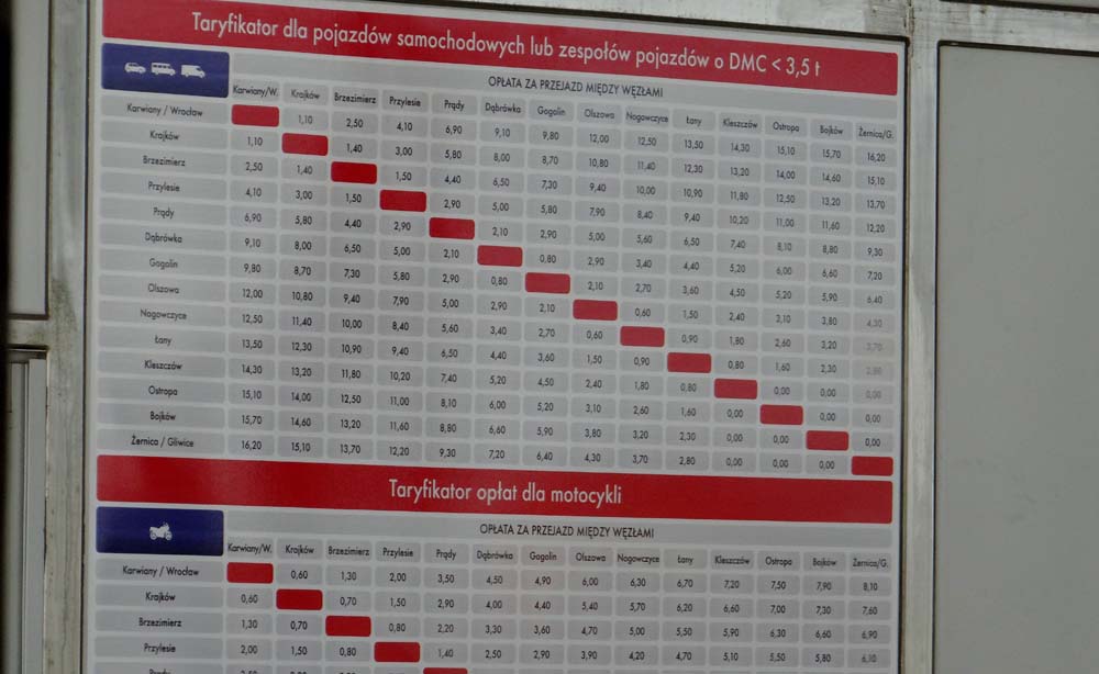 When we finally reached the toll booths, having driven the entire stretch of the toll road from Gliwice to Wroclaw, the woman in the booth leant out and looked along Dave trying to assess his length. Next to us a Dutch caravaner was deep in conversation with his toll booth attendant, arms were waving and we suspect he (and his mate behind him also with a caravan) might be classed as being too long for the lanes we were in. Passing over our laminated card which lives on Dave’s dashboard and reminds us of his height, weight, width and length (often vital information needed in a hurry) the attendant looked at the side which had his tyre pressures and wheelbase measurements before nodding in agreement – we are a short motorhome and worthy of her lane. The price flashed up as 16.20 zloty (about £3.30) which we handed over quickly and drove off before she changed her mind – a bargain, we’ve saved way more than that in fuel by cruising along the motorway.