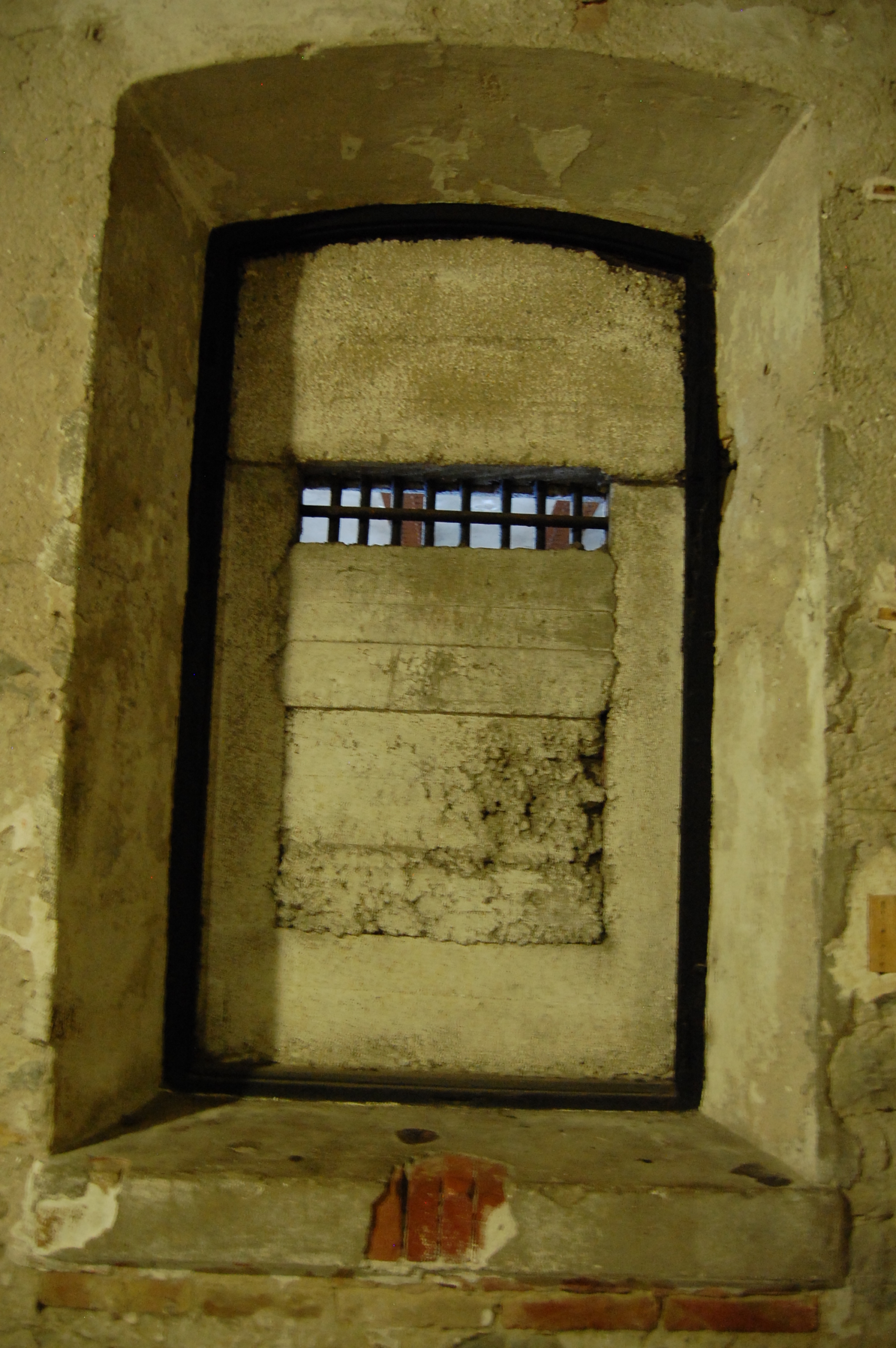 Thunder’s breaking above as I write this, intermittent floods of rain hammering on the roof force us to shout out load to each other, although we’re only a couple of meters apart (N45.621031, E13.789258). To my left, through our plastic motorhome window, I can almost touch the outline of a tall window in a stone wall. It’s been filled, leaving a small metal-barred gap, by roughly-laid concrete. It’s the window into a death camp.