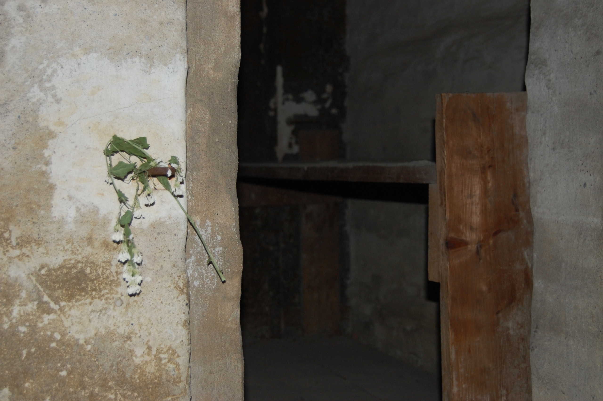 - A few drying, dead flowers are dotted around, this one hung from outside a cell.