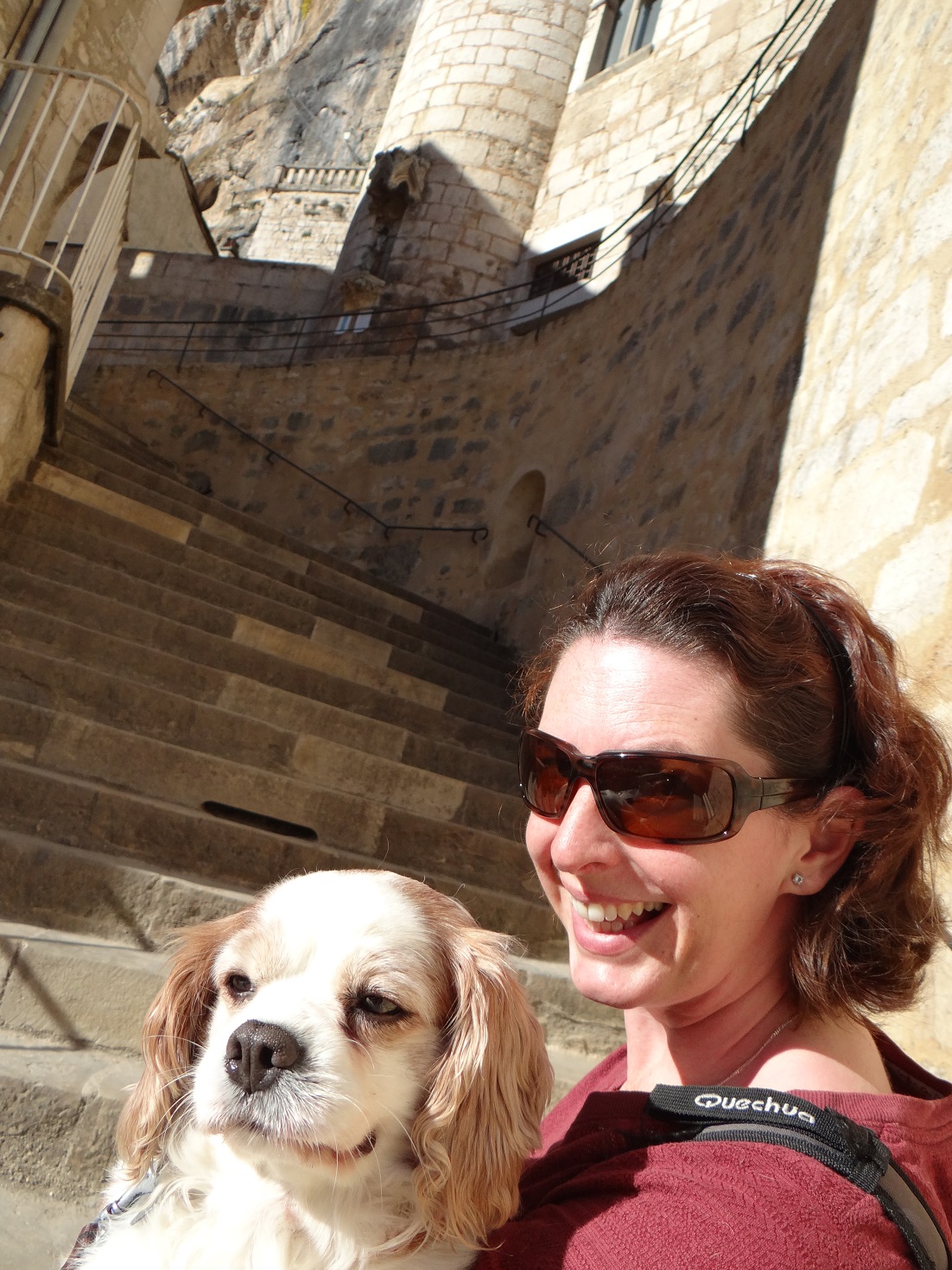 Not that I let that bother me. We were out last night in the dark, and again before dawn this morning, alone but for each other, snapping away a hundred times. We took our time to walk along the narrow roads, through 700 year old archways, past tat shops, medieval-looking loos, telepheriques and restaurants, carrying Charlie up the great staircases where kings would on occasional knee their way up in a show of reverence. Yesterday we met a French couple with a 2 year old version of Charlie. Retired growers of Champagne (he half-bashfullly showed me a photo of his 11m Concorde with him using a winch to roll a Fiat 500 out the back), they made a great attempt to chat with us about dogs, travelling with a large van in the UK and the nearby caves (like the ones we saw in Greece and Slovenia). I have to admit I was glad when the conversion grew to a close, my lack of French was beginning to twist my head backwards and my eyeballs were starting to hurt.