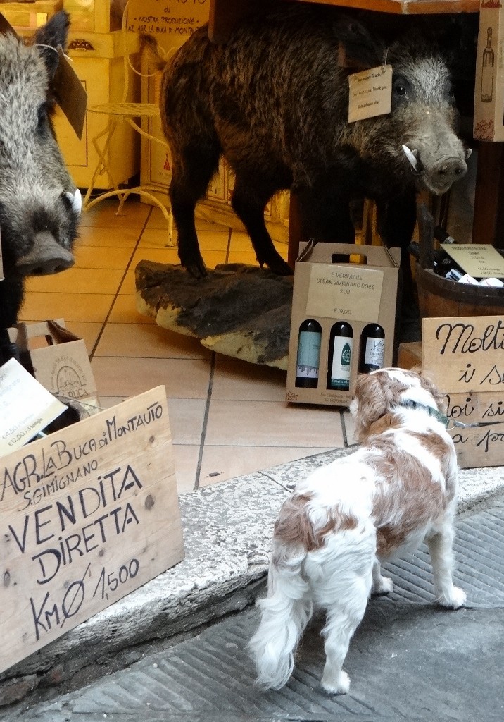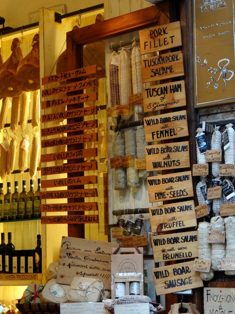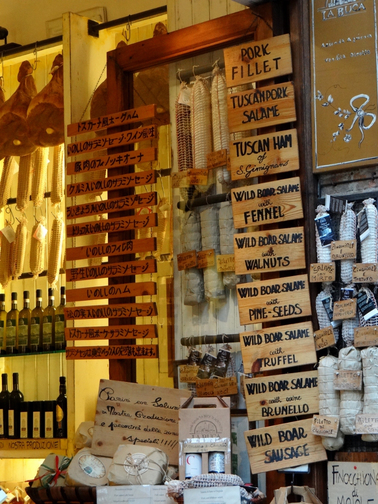 Nearly all the shops sell souvenirs, wine or tasty treats (with signage in several languages) – wild boar ham anyone?