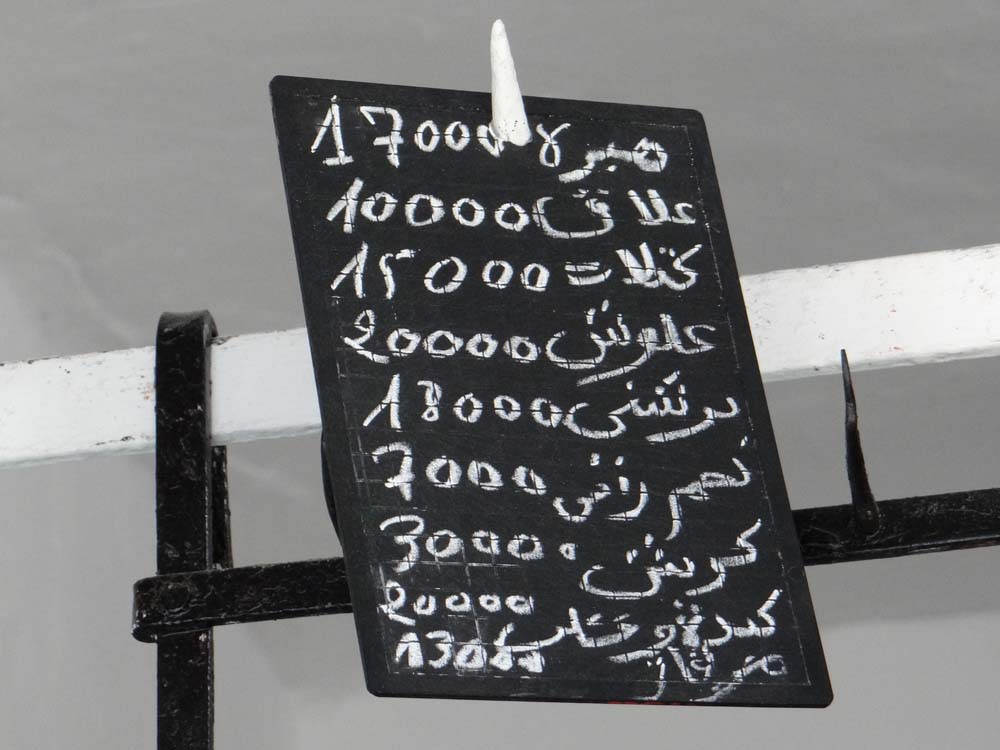 Price list at the butchers. Despite Ju’s Arabic lesson in Sousse, we still have no idea what anything is.