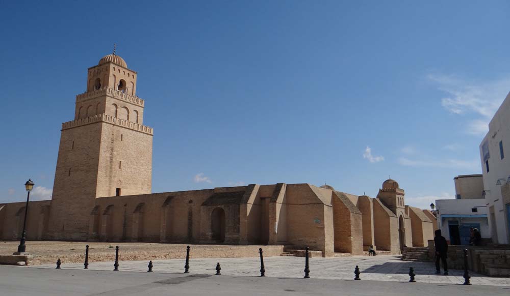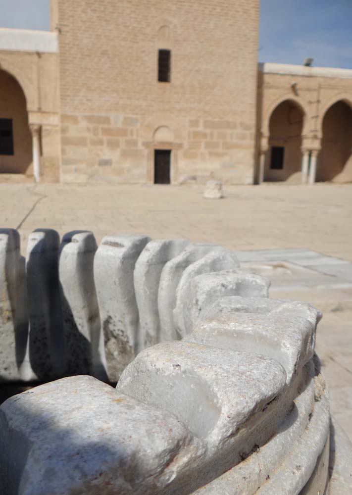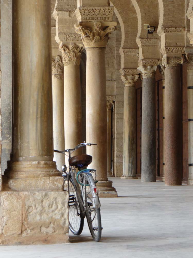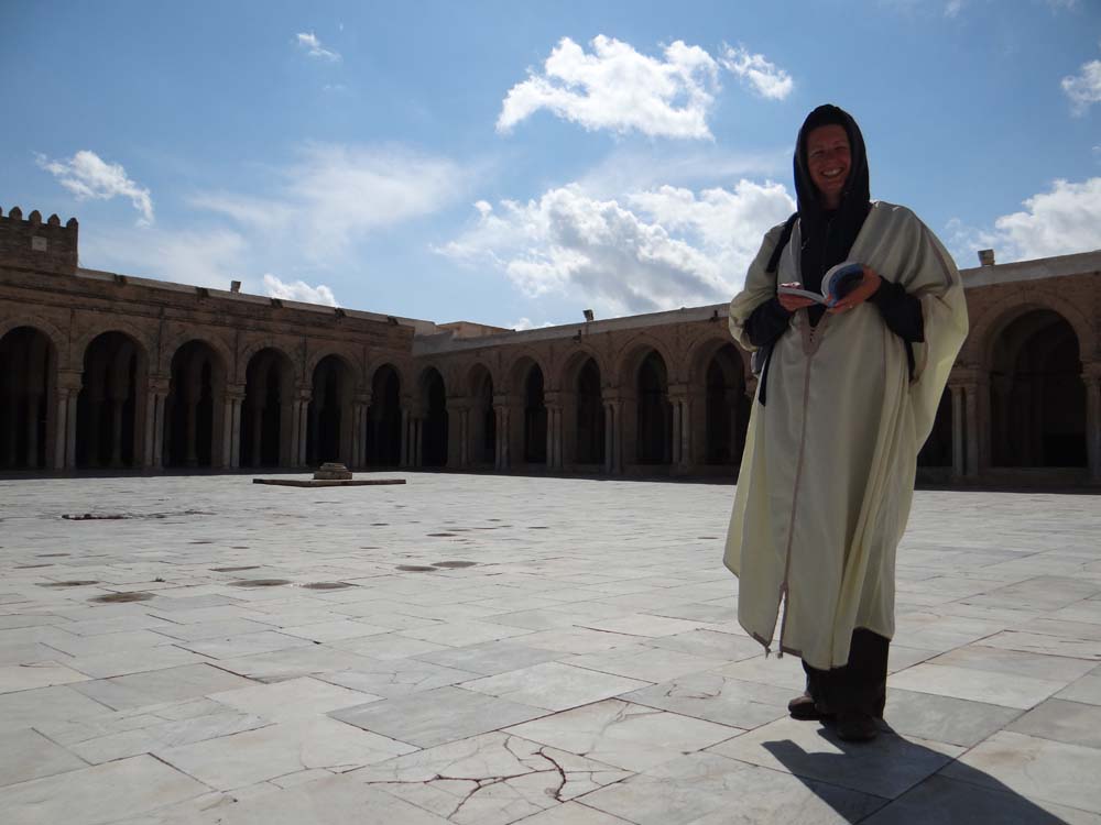 Much of the place has been around for over 1000 years, and it is indeed rather large, one of the most important in Tunisia. The guy on the gate recognised us from yesterday, asking where our little dog was, before fetching a robe for Ju to wear as trousers or jeans aren’t allowed. As we’re non-Muslim, mosques in Morocco and Tunisia are, as a rule, off limits. Even in this one a third of it, the prayer room, is only viewable to us from the doorways. As we took in the sight of the inside of it, sparse, fortress-like, I was torn.